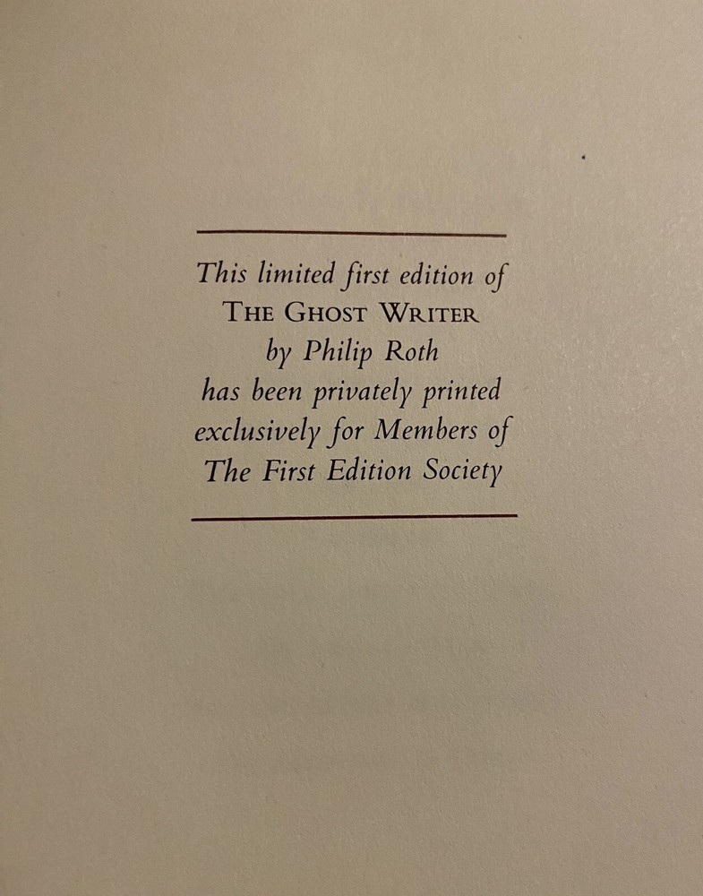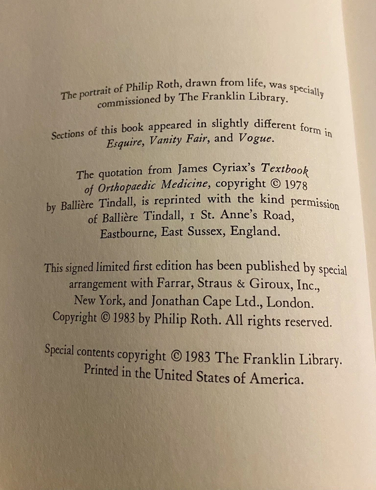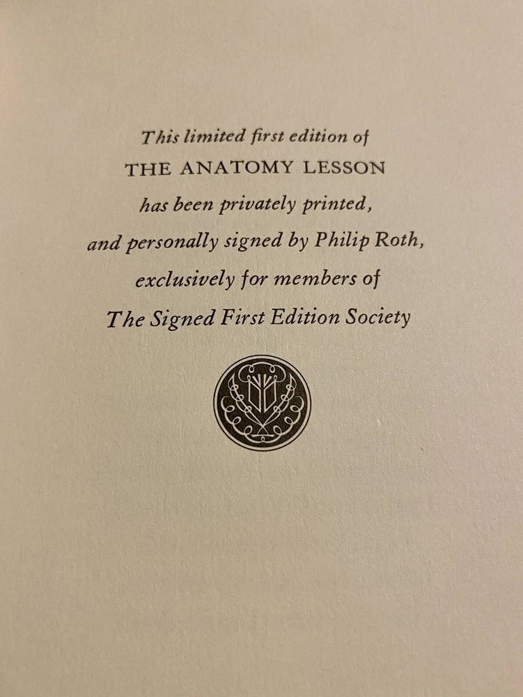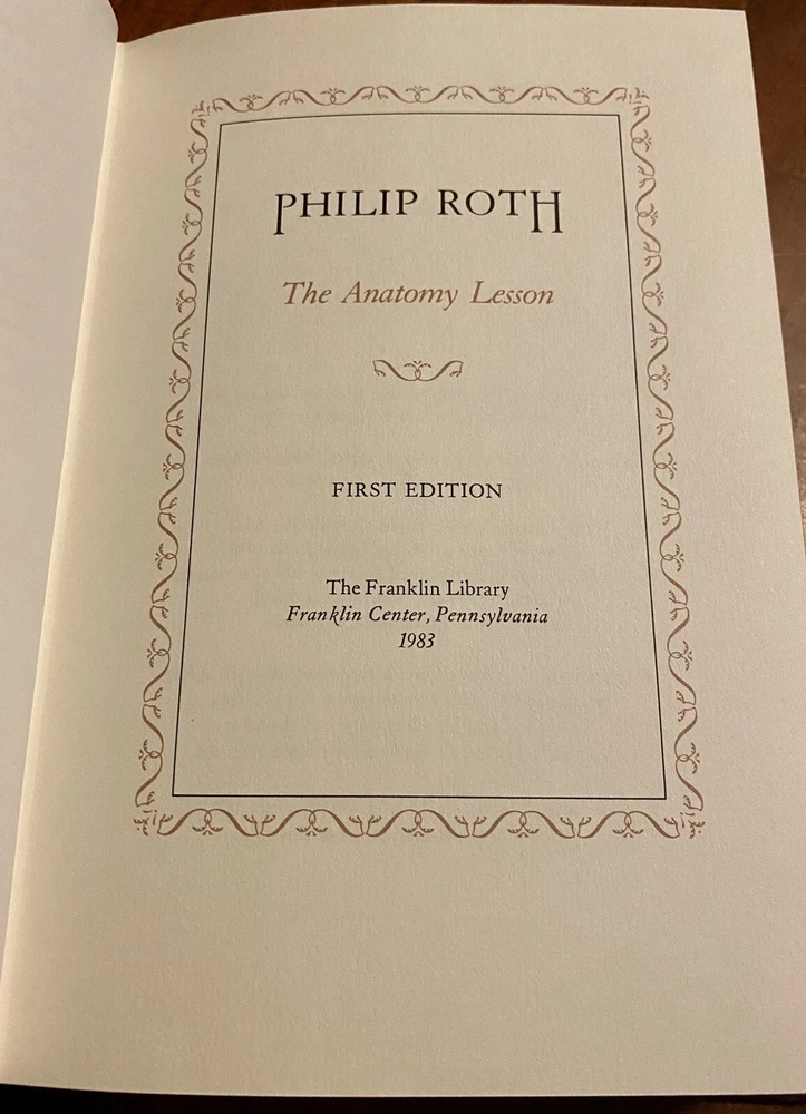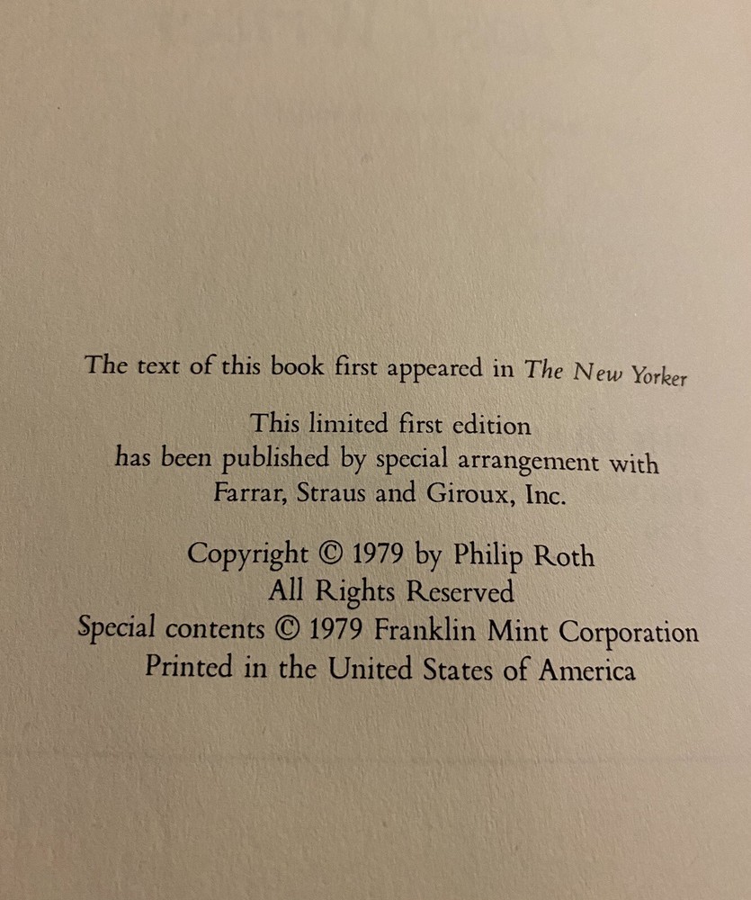 This is a special book set authored by the renowned Philip Roth. The set includes 1st editions of both The Ghost Writer and The Anatomy Lesson, with the author’s signature in The Anatomy Lesson! Both books are leather bound and in excellent condition with little to no wear. The Ghost Writer is a 1979 copy with the previous owner stamp on the bottom corner of the second page. The Anatomy Lesson is from 1983. The books are considered collector's edition with limited availability. The set is a must-have for book collectors and enthusiasts alike who appreciate the work of Philip Roth. Let me know if you have any questions about either book.