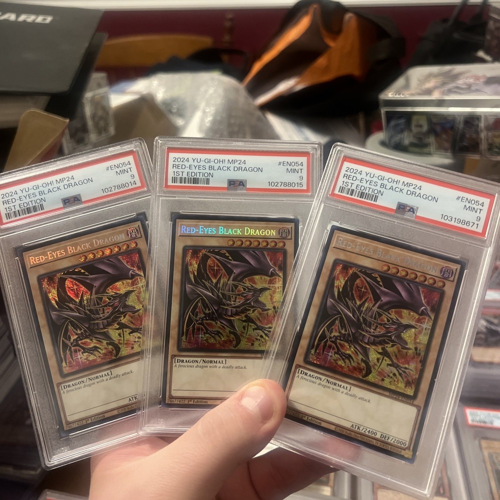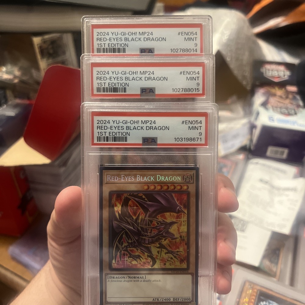 PSA 9 Mint Red-Eyes Black Dragon cards from the 2024 MP24 Dueling Mirrors set in the Yu-Gi-Oh! TCG. These cards are 1st edition and feature a holo finish, making them highly sought after by collectors. Graded by Professional Sports Authenticator (PSA), these cards are part of the Quarter Century Secret Rare rarity category. Manufactured by Konami in Japan, these cards are in English language and belong to the Monster Card type, specifically the Dragon monster type. The set includes a Red-Eyes Black Dragon card with a PSA 9 mint grade, making it a valuable addition to any Yu-Gi-Oh! card collection.