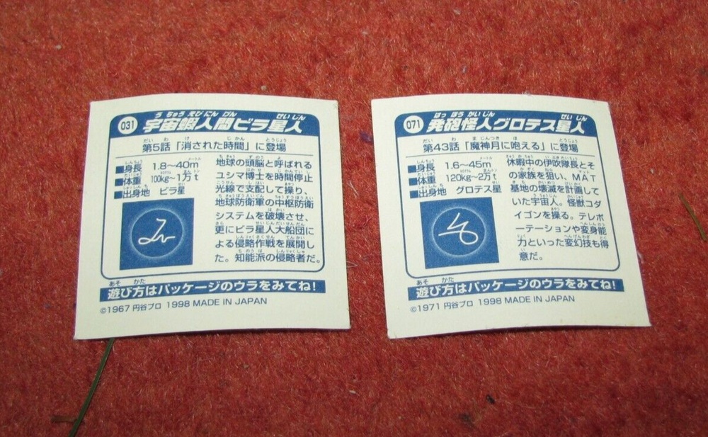 DESCRIPTION OF ITEM Set of (2) Ultraman Stickers. I think they are from BANDAI No. 071 & 031. 2" x 2" Excellent new condition. Check out my Ebay store: djamesk | eBay Stores ------------------------------------------------------------------------------------------------------------------------------------------------------------ Track Page Views With Auctiva's FREE Counter