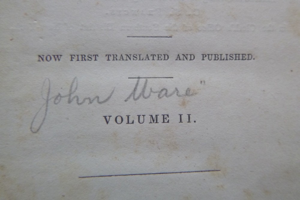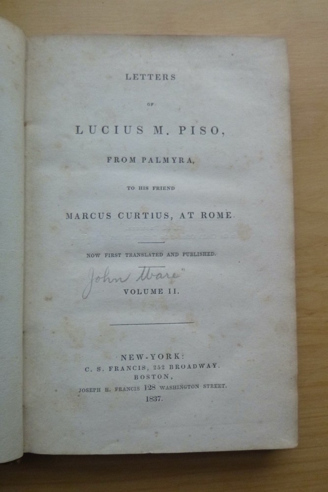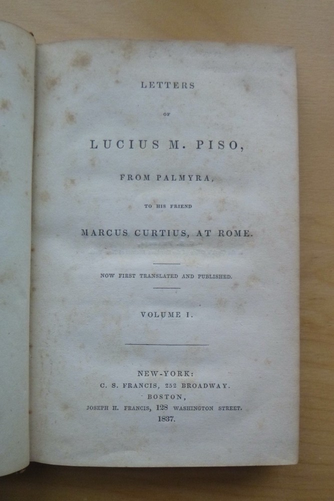 2 Vol Set 1st ed Letters of Lucius M Piso to Marcus Curtius (Hardcovers, 1837) Letters of Lucius M. Piso, from Palmyra, to his Friend Marcus Curtius, at Rome In 2 volumes, “Now first translated and published” Published in 1837 by C.S. Francis in New York and Joseph H. Francis in Boston. 1st edition, hardcovers, no dust jackets, 12mo with calf leather boards, pastedown title blocks on the spines, 243 pages in Volume I, 256 pages in Volume II. London. Text is lightly tanned and has some foxing, mainly to the endpages. Text is unmarked except for former owners name and acquisition information on the front endpages and the name of the translator written on the title page of Volume II. Covers are worn with frayed edges, faded title blocks, mottled covers, and some tearing to the bottom of both spines. _gsrx_vers_1715 (GS 9.9.2 (1715))