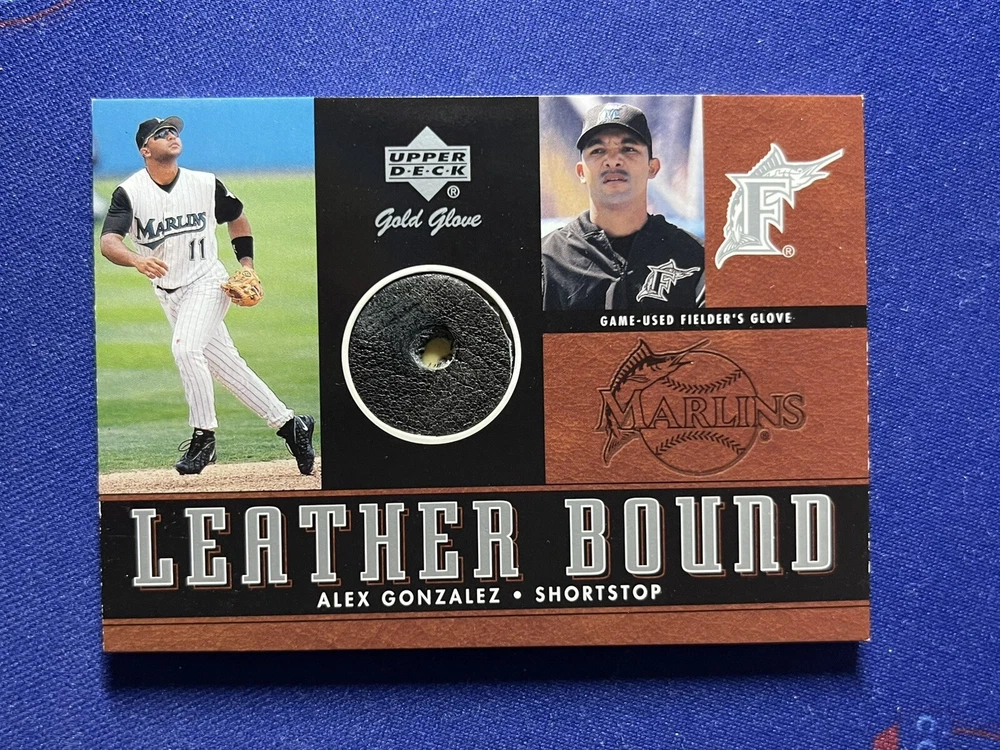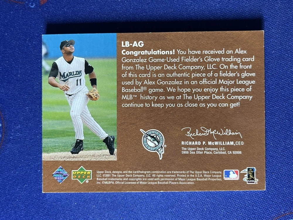 This 2001 Upper Deck Gold Glove trading card features Major League Baseball player Álex González and a game-used glove relic. The card is part of the base set and is a short print, making it a valuable addition to any sports trading card collection. The card is bound in leather and features the Florida and Miami Marlins logos, as well as González's name and card number LB-AG. As a memorabilia card, it is a must-have for any fan of the sport. Add this card to your collection today!