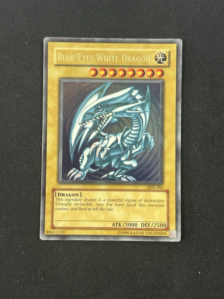 The product is a 2002 Yu-Gi-Oh! TCG Blue Eyes White Dragon card, known as SDK-001, which is classified as an Ultra Rare 1st Edition card. This collectible card features the attributes of White and Blue, and belongs to the Dragon series. As a sought-after item in the Yu-Gi-Oh! card game community, the Blue Eyes White Dragon card holds value for collectors and players alike due to its rarity and iconic design.