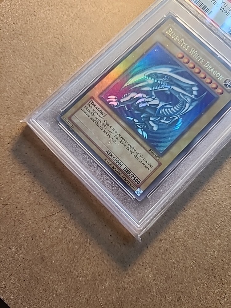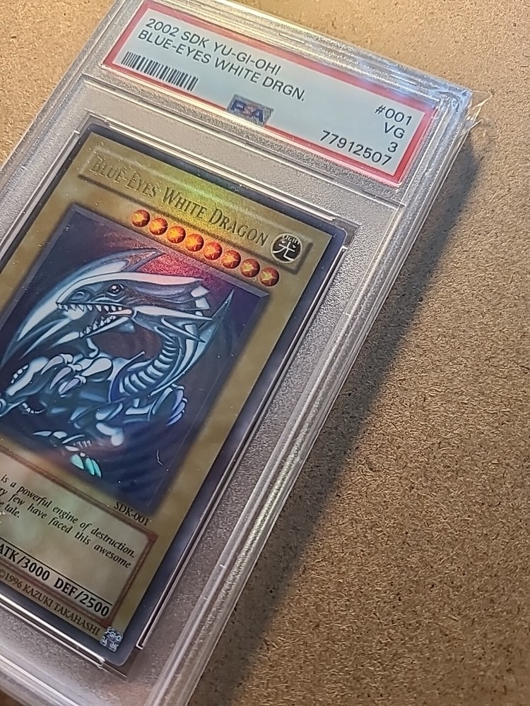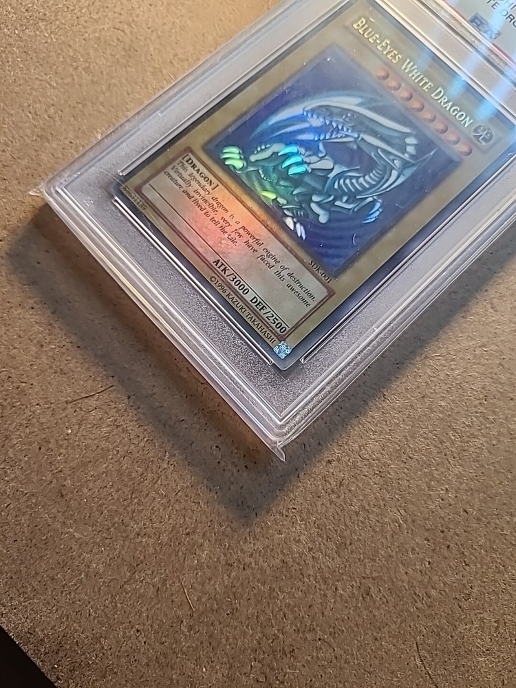 This 2002 ultra-rare Blue Eyes White Dragon card from the Yu-Gi-Oh! TCG is a must-have for any collector. With a PSA 3 rating and a holographic finish, this English language card is sure to impress. The card features the iconic Blue-Eyes White Dragon creature type and is numbered SDK-001. Manufactured by Konami, this normal card is a great addition to any collection. Its rarity and unique attributes make it a valuable find for any fan of the Yu-Gi-Oh! TCG. Don't miss your chance to own this impressive card.