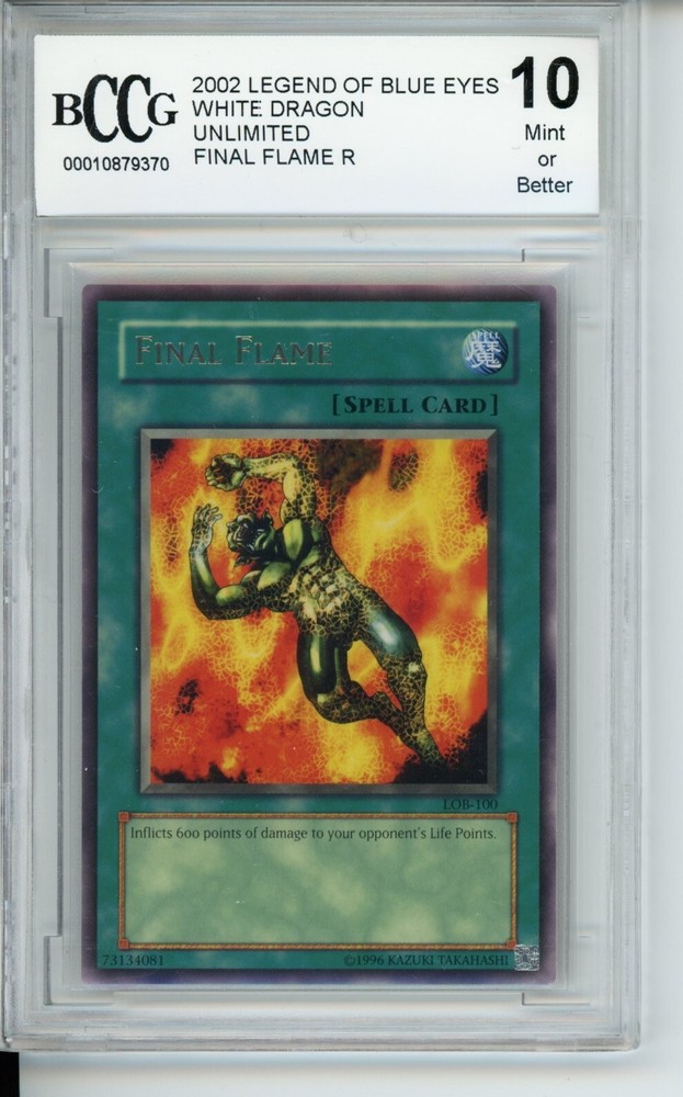 Final Flame R Unlimited Legend of Blue Eyes White Dragon LOB-EN100 with a BCCG Grade 10. See pictures for detail: Delivery Confirmation . Will be shipped with card boards on each side and Bubble wrap for protection. Great card to have for those TCG collectors out there! Free Shipping!
