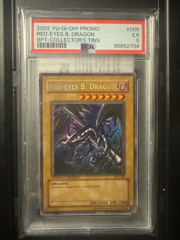 This is a rare and highly sought-after card from the Yu-Gi-Oh! TCG game. The 2002 Red-Eyes B. Dragon BPT-005 Limited Edition Promo Secret Rare PSA 5 is a card that will make a great addition to any collector's set. This card features the iconic characters Yami Yugi, Joey Wheeler, and Yugi Muto, and is a must-have for any fan of the game.The card is in excellent shape and has been professionally graded with a score of 275010. It comes from the BPT Collector's Tins set and has a foil finish. This card is a rare find and is sure to be a valuable addition to any collection.