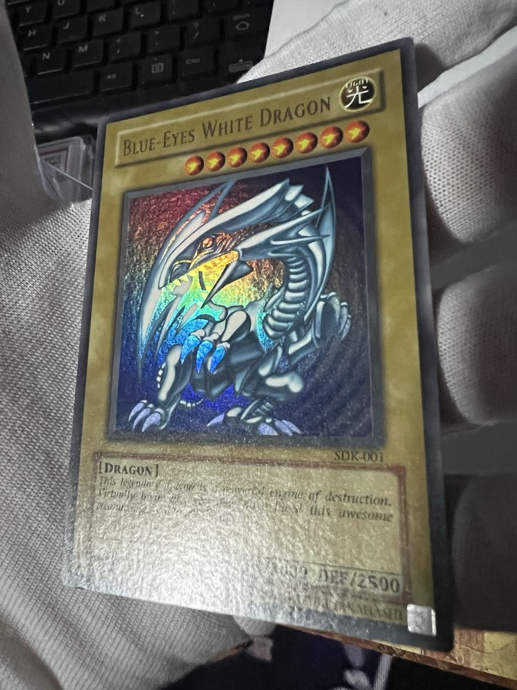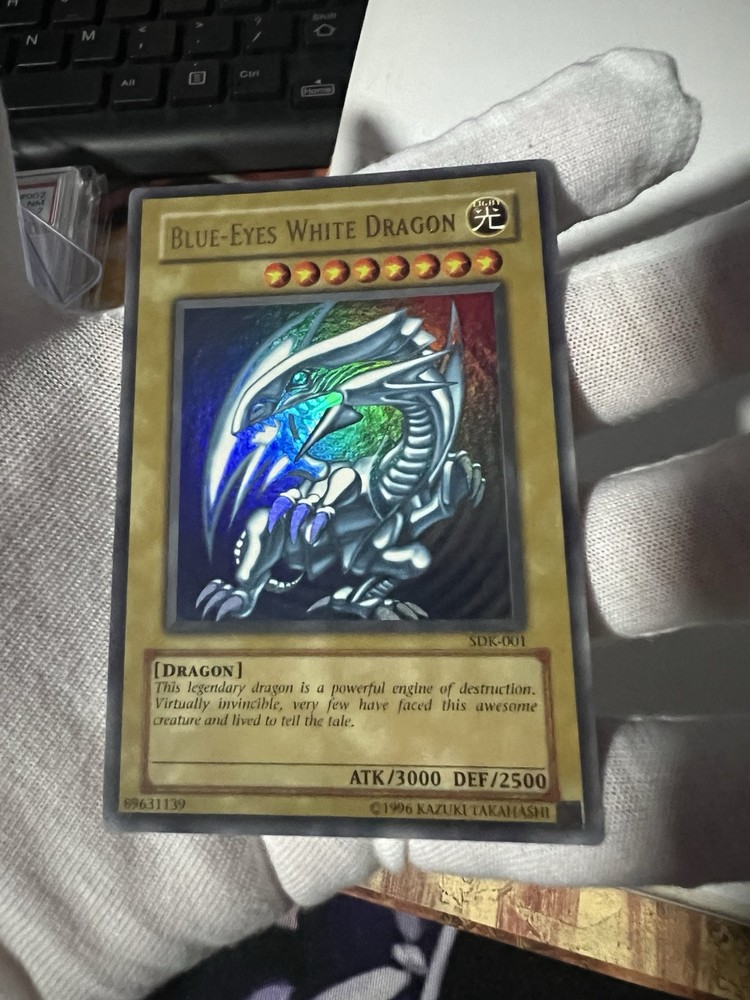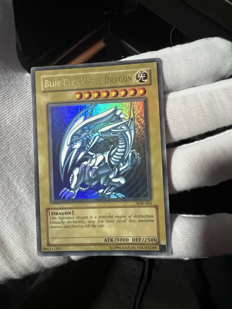 The product is a 2002 Yu-Gi-Oh! "Blue-Eyes White Dragon" card from the SDK set. It is an Ultra Rare card with Holo finish and features the character Blue-Eyes White Dragon. The card is in near mint or better condition and is part of the Collectors Edition. It has an Attack/Power of 3000, Defense/Toughness of 2500, and is known for its invincibility. This English-language card is a prized possession for Yu-Gi-Oh! collectors. This blue eyes was part of my old yugioh collection. Has been sleeved since I’ve had it. Card looks in really good shape with no visible scratches or creases of any sort. Will be shipped safely and double sleeved. Will come in the magnet case as pictured. For any questions or concerns please reach out, thanks (:
