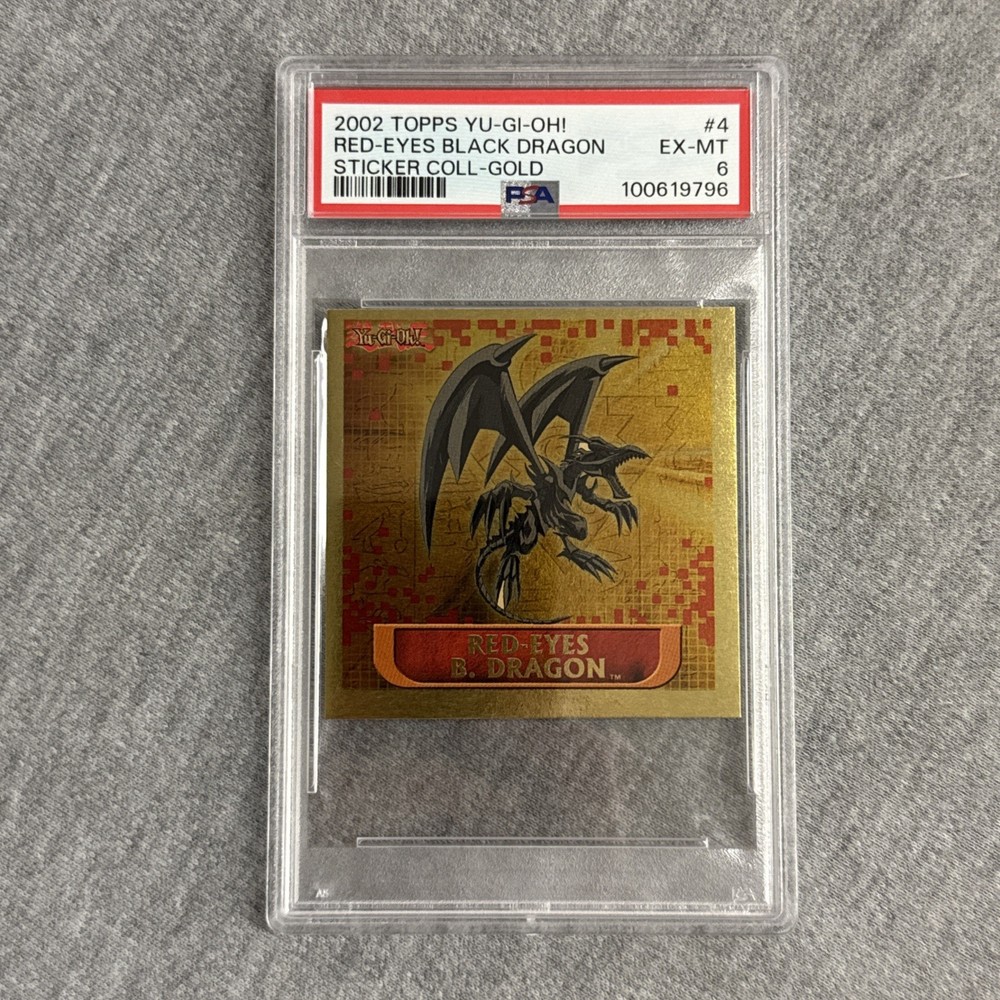 2002 Topps Yu-Gi-Oh! Sticker Collection #4 Red-Eyes Black Dragon Gold PSA 6 EX-MT Item Details A picture says a thousand words, please refer to pictures for full condition and specific item details. Please note that you are purchasing the exact contents pictured and only what is pictured. If it is not pictured, then it is not included in this listing. Assume major cosmetic wear; scratches, chips, cuts, cracks, dents, and dings on any part of any item that is not pictured. It is your responsibility as the buyer to obtain any information prior to completing your purchase. If you have any questions or concerns, please ask and we will respond as soon as possible. Best offers will not be considered if sent through an eBay message. Remember we are human, and errors do happen, we are here to provide the best experience and are willing to help where we can. Please understand that all issues that may arise or you are experiencing will be handled according within normal business hours. Any requests made after an item is purchased will be decided upon by our discretion, we reserve the right to cancel any order. Shipping Please note that items are shipped Monday-Friday. All items will be shipped the most cost-efficient way via USPS, FedEx, or UPS. Please note that we only offer free shipping to the 48 continental states. We do not ship directly to Alaska, Hawaii, APO, FPO, or PO boxes. Any purchase with the use of a restricted shipping address will be cancelled. Shipping address cannot be altered after purchase as per eBay policy. All international items will be shipped using the Global Shipping Program Only. Local pick up is not offered for any listing. Please contact us before completing purchase if you have any special requests or concerns, we are willing to complete the necessary accommodations within the best of our abilities. Returns Please note that returns are to be handled directly according to the selected return policy. Any new, sealed, unopened, or items altered in any way are not eligible for return. All returns are subjected to a 20% restocking fee, where applicable. Return shipping cost is the buyers responsibility.