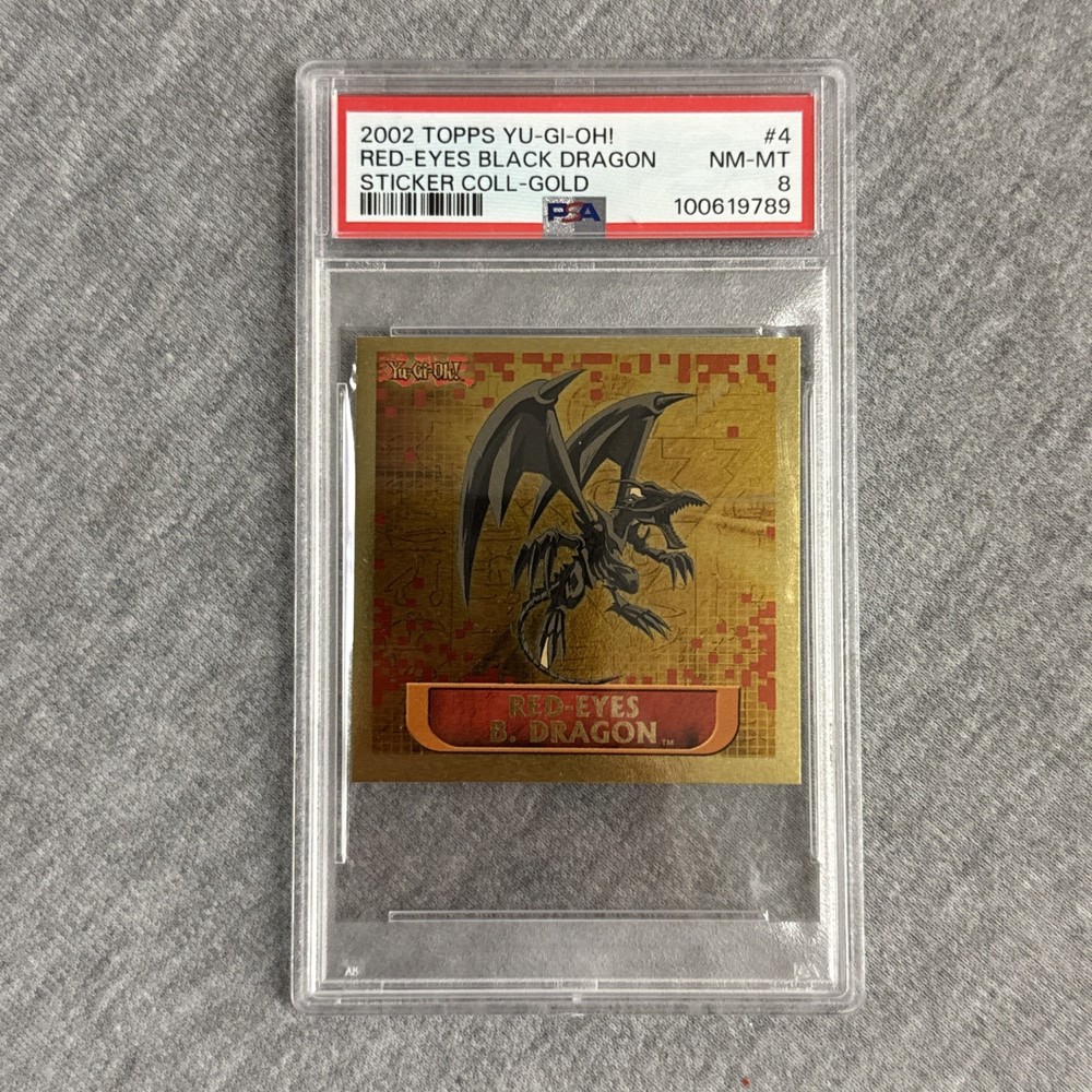 2002 Topps Yu-Gi-Oh! Sticker Collection #4 Red-Eyes Black Dragon Gold PSA 8 Item Details A picture says a thousand words, please refer to pictures for full condition and specific item details. Please note that you are purchasing the exact contents pictured and only what is pictured. If it is not pictured, then it is not included in this listing. Assume major cosmetic wear; scratches, chips, cuts, cracks, dents, and dings on any part of any item that is not pictured. It is your responsibility as the buyer to obtain any information prior to completing your purchase. If you have any questions or concerns, please ask and we will respond as soon as possible. Best offers will not be considered if sent through an eBay message. Remember we are human, and errors do happen, we are here to provide the best experience and are willing to help where we can. Please understand that all issues that may arise or you are experiencing will be handled according within normal business hours. Any requests made after an item is purchased will be decided upon by our discretion, we reserve the right to cancel any order. Shipping Please note that items are shipped Monday-Friday. All items will be shipped the most cost-efficient way via USPS, FedEx, or UPS. Please note that we only offer free shipping to the 48 continental states. We do not ship directly to Alaska, Hawaii, APO, FPO, or PO boxes. Any purchase with the use of a restricted shipping address will be cancelled. Shipping address cannot be altered after purchase as per eBay policy. All international items will be shipped using the Global Shipping Program Only. Local pick up is not offered for any listing. Please contact us before completing purchase if you have any special requests or concerns, we are willing to complete the necessary accommodations within the best of our abilities. Returns Please note that returns are to be handled directly according to the selected return policy. Any new, sealed, unopened, or items altered in any way are not eligible for return. All returns are subjected to a 20% restocking fee, where applicable. Return shipping cost is the buyers responsibility.