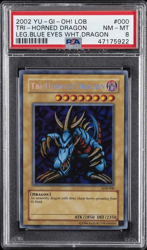 2002 YU-GI-OH! LOB-LEGEND OF BLUE EYES WHITE DRAGON #000 TRI-HORNED DRAGON PSA 8 2002 YU-GI-OH! LOB-LEGEND OF BLUE EYES WHITE DRAGON #000 TRI-HORNED DRAGON PSA 8 Purchase Info Thank you for your interest in this item consigned with PSA! By purchasing or making an offer on this item, you acknowledge and agree to the following terms: All sales are final. Returns not accepted. Payment must be made upon purchase of the item. All items are sold "as is" and without warranty of Collectors Universe, Inc. (d/b/a PSA), and ANY AND ALL IMPLIED WARRANTIES ARE DISCLAIMED AND EXCLUDED. Sales tax may apply depending on shipping address. PSA does not guarantee that another third-party grading company's authentication or certification of an item as genuine is correct or accurate. Neither a difference of opinion between third-party grading companies about authenticity, nor a company's subsequent reversal of its earlier authentication or certification of an item, will be a basis for rescinding a sale. Any dispute with another third-party grading company relating to the authenticity of an item must be resolved directly with that other company. Collectors' maximum liability in the event of loss or damage to an item during shipping will be the lesser of (a) the price paid for the item and (b) the change in fair market value of the item. You release Collectors from all other liability including for any claims of punitive damages, emotional distress, consequential damages, lost profits, or lost interest, except as prohibited by law. Shipping Purchased Items will be shipped directly from PSA Vault. You stay hands-free. PSA Vault When you purchase this item, you can save on sales tax and selling fees by keeping it in the PSA Vault, official Vault of eBay. Items already in PSA Vault and will be sent to PSA Vault will have no shipping charge Storage of any items with the PSA Vault will be subject to the PSA Vault Terms of Service. Consignment PSA has competitive rates on the world's largest collectibles marketplace with the option to list from the PSA Vault or immediately after PSA authentication and grading. Sale Price Under $100 $100 - $499 $500 - $999 $1,000 - $2,499 $2,500 - $4,999 $5,000+ Seller Fee 16% 14% 13% 10% 9% 7% Sellers pay a single fee as reflected above; no additional eBay fees are incurred. There is a $5 minimum fee on sold items.
