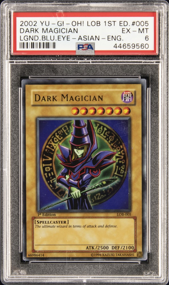 2002 YU-GI-OH! LOB-LEGEND OF BLUE EYES WHITE DRAGON 1ST EDITION-ASIAN-ENGLISH #005 DARK MAGICIAN PSA 6 2002 YU-GI-OH! LOB-LEGEND OF BLUE EYES WHITE DRAGON 1ST EDITION-ASIAN-ENGLISH #005 DARK MAGICIAN PSA 6 Purchase Info Thank you for your interest in this item consigned with PSA! By purchasing or making an offer on this item, you acknowledge and agree to the following terms: All sales are final. Returns not accepted. Payment must be made upon purchase of the item. All items are sold "as is" and without warranty of Collectors Universe, Inc. (d/b/a PSA), and ANY AND ALL IMPLIED WARRANTIES ARE DISCLAIMED AND EXCLUDED. Sales tax may apply depending on shipping address. PSA does not guarantee that another third-party grading company's authentication or certification of an item as genuine is correct or accurate. Neither a difference of opinion between third-party grading companies about authenticity, nor a company's subsequent reversal of its earlier authentication or certification of an item, will be a basis for rescinding a sale. Any dispute with another third-party grading company relating to the authenticity of an item must be resolved directly with that other company. Collectors' maximum liability in the event of loss or damage to an item during shipping will be the lesser of (a) the price paid for the item and (b) the change in fair market value of the item. You release Collectors from all other liability including for any claims of punitive damages, emotional distress, consequential damages, lost profits, or lost interest, except as prohibited by law. Shipping Purchased Items will be shipped directly from PSA Vault. You stay hands-free. PSA Vault When you purchase this item, you can save on sales tax and selling fees by keeping it in the PSA Vault, official Vault of eBay. Items already in PSA Vault and will be sent to PSA Vault will have no shipping charge Storage of any items with the PSA Vault will be subject to the PSA Vault Terms of Service. Consignment PSA has competitive rates on the world's largest collectibles marketplace with the option to list from the PSA Vault or immediately after PSA authentication and grading. Sale Price Under $100 $100 - $499 $500 - $999 $1,000 - $2,499 $2,500 - $4,999 $5,000+ Seller Fee 16% 14% 13% 10% 9% 7% Sellers pay a single fee as reflected above; no additional eBay fees are incurred. There is a $5 minimum fee on sold items.
