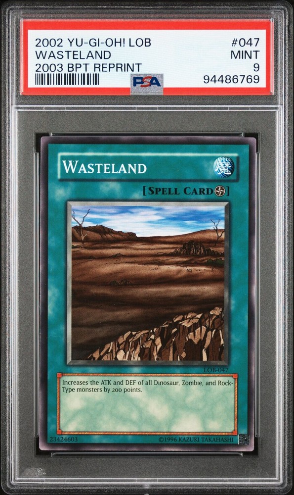 The product is a Yu-Gi-Oh! Trading Card Game card from the Legend of Blue Eyes White Dragon set, specifically card number 047, titled "Waste Land." This card has been professionally graded by PSA as a 9, indicating its high quality and value to collectors. It features in the CCG Individual Cards and Collectible Card Games categories, making it a sought-after item for enthusiasts of the Yu-Gi-Oh! TCG.