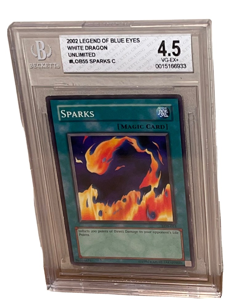 2002 YU-GI-OH! LOB-LEGEND OF BLUE EYES WHITE DRAGON #055 SPARKS PSA 9 2002 YU-GI-OH! LOB-LEGEND OF BLUE EYES WHITE DRAGON #055 SPARKS PSA 9 Purchase Info Thank you for your interest in this item consigned with PSA! By purchasing or making an offer on this item, you acknowledge and agree to the following terms: All sales are final. Returns not accepted. Payment must be made upon purchase of the item. All items are sold "as is" and without warranty of Collectors Universe, Inc. (d/b/a PSA), and ANY AND ALL IMPLIED WARRANTIES ARE DISCLAIMED AND EXCLUDED. Sales tax may apply depending on shipping address. PSA does not guarantee that another third-party grading company's authentication or certification of an item as genuine is correct or accurate. Neither a difference of opinion between third-party grading companies about authenticity, nor a company's subsequent reversal of its earlier authentication or certification of an item, will be a basis for rescinding a sale. Any dispute with another third-party grading company relating to the authenticity of an item must be resolved directly with that other company. Collectors' maximum liability in the event of loss or damage to an item during shipping will be the lesser of (a) the price paid for the item and (b) the change in fair market value of the item. You release Collectors from all other liability including for any claims of punitive damages, emotional distress, consequential damages, lost profits, or lost interest, except as prohibited by law. Shipping Purchased Items will be shipped directly from PSA Vault. You stay hands-free. PSA Vault When you purchase this item, you can save on sales tax and selling fees by keeping it in the PSA Vault, official Vault of eBay. Items already in PSA Vault and will be sent to PSA Vault will have no shipping charge Storage of any items with the PSA Vault will be subject to the PSA Vault Terms of Service. Consignment PSA has competitive rates on the world's largest collectibles marketplace with the option to list from the PSA Vault or immediately after PSA authentication and grading. Sale Price Under $100 $100 - $499 $500 - $999 $1,000 - $2,499 $2,500 - $4,999 $5,000+ Seller Fee 16% 14% 13% 10% 9% 7% Sellers pay a single fee as reflected above; no additional eBay fees are incurred. There is a $5 minimum fee on sold items.