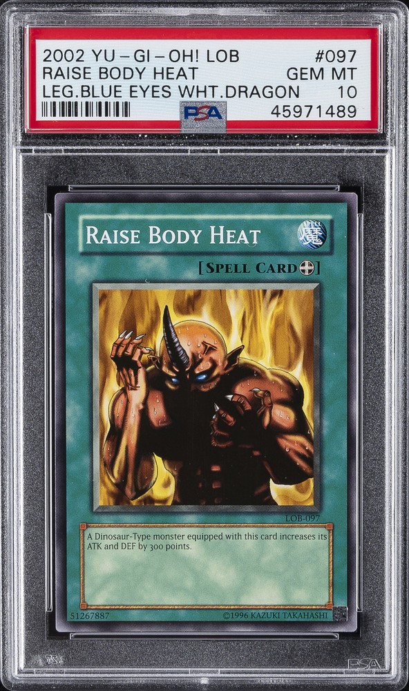 2002 YU-GI-OH! LOB-LEGEND OF BLUE EYES WHITE DRAGON #097 RAISE BODY HEAT PSA 10 2002 YU-GI-OH! LOB-LEGEND OF BLUE EYES WHITE DRAGON #097 RAISE BODY HEAT PSA 10 Purchase Info Thank you for your interest in this item consigned with PSA! By purchasing or making an offer on this item, you acknowledge and agree to the following terms: All sales are final. Returns not accepted. Payment must be made upon purchase of the item. All items are sold "as is" and without warranty of Collectors Universe, Inc. (d/b/a PSA), and ANY AND ALL IMPLIED WARRANTIES ARE DISCLAIMED AND EXCLUDED. Sales tax may apply depending on shipping address. PSA does not guarantee that another third-party grading company's authentication or certification of an item as genuine is correct or accurate. Neither a difference of opinion between third-party grading companies about authenticity, nor a company's subsequent reversal of its earlier authentication or certification of an item, will be a basis for rescinding a sale. Any dispute with another third-party grading company relating to the authenticity of an item must be resolved directly with that other company. Collectors' maximum liability in the event of loss or damage to an item during shipping will be the lesser of (a) the price paid for the item and (b) the change in fair market value of the item. You release Collectors from all other liability including for any claims of punitive damages, emotional distress, consequential damages, lost profits, or lost interest, except as prohibited by law. Shipping Purchased Items will be shipped directly from PSA Vault. You stay hands-free. PSA Vault When you purchase this item, you can save on sales tax and selling fees by keeping it in the PSA Vault, official Vault of eBay. Items already in PSA Vault and will be sent to PSA Vault will have no shipping charge Storage of any items with the PSA Vault will be subject to the PSA Vault Terms of Service. Consignment PSA has competitive rates on the world's largest collectibles marketplace with the option to list from the PSA Vault or immediately after PSA authentication and grading. Sale Price Under $100 $100 - $499 $500 - $999 $1,000 - $2,499 $2,500 - $4,999 $5,000+ Seller Fee 16% 14% 13% 10% 9% 7% Sellers pay a single fee as reflected above; no additional eBay fees are incurred. There is a $5 minimum fee on sold items.