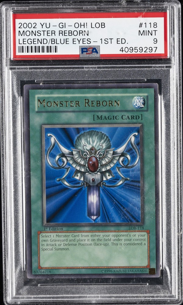 2002 YU-GI-OH! LOB-LEGEND OF BLUE EYES WHITE DRAGON 1ST EDITION #118 MONSTER REBORN PSA 9 2002 YU-GI-OH! LOB-LEGEND OF BLUE EYES WHITE DRAGON 1ST EDITION #118 MONSTER REBORN PSA 9 Purchase Info Thank you for your interest in this item consigned with PSA! By purchasing or making an offer on this item, you acknowledge and agree to the following terms: All sales are final. Returns not accepted. Payment must be made upon purchase of the item. All items are sold "as is" and without warranty of Collectors Universe, Inc. (d/b/a PSA), and ANY AND ALL IMPLIED WARRANTIES ARE DISCLAIMED AND EXCLUDED. Sales tax may apply depending on shipping address. PSA does not guarantee that another third-party grading company's authentication or certification of an item as genuine is correct or accurate. Neither a difference of opinion between third-party grading companies about authenticity, nor a company's subsequent reversal of its earlier authentication or certification of an item, will be a basis for rescinding a sale. Any dispute with another third-party grading company relating to the authenticity of an item must be resolved directly with that other company. Collectors' maximum liability in the event of loss or damage to an item during shipping will be the lesser of (a) the price paid for the item and (b) the change in fair market value of the item. You release Collectors from all other liability including for any claims of punitive damages, emotional distress, consequential damages, lost profits, or lost interest, except as prohibited by law. Shipping Purchased Items will be shipped directly from PSA Vault. You stay hands-free. PSA Vault When you purchase this item, you can save on sales tax and selling fees by keeping it in the PSA Vault, official Vault of eBay. Items already in PSA Vault and will be sent to PSA Vault will have no shipping charge Storage of any items with the PSA Vault will be subject to the PSA Vault Terms of Service. Consignment PSA has competitive rates on the world's largest collectibles marketplace with the option to list from the PSA Vault or immediately after PSA authentication and grading. Sale Price Under $100 $100 - $499 $500 - $999 $1,000 - $2,499 $2,500 - $4,999 $5,000+ Seller Fee 16% 14% 13% 10% 9% 7% Sellers pay a single fee as reflected above; no additional eBay fees are incurred. There is a $5 minimum fee on sold items.
