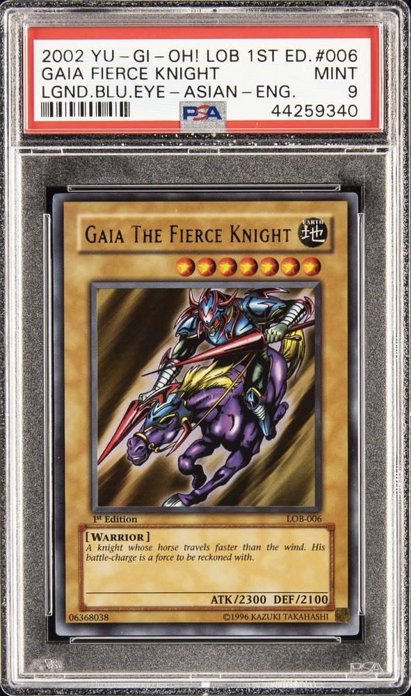 2002 YU-GI-OH! LOB-LEGEND OF BLUE EYES WHITE DRAGON 1ST EDITION-ASIAN-ENGLISH #006 GAIA THE FIERCE KNIGHT PSA 9 2002 YU-GI-OH! LOB-LEGEND OF BLUE EYES WHITE DRAGON 1ST EDITION-ASIAN-ENGLISH #006 GAIA THE FIERCE KNIGHT PSA 9 Purchase Info Thank you for your interest in this item consigned with PSA! By purchasing or making an offer on this item, you acknowledge and agree to the following terms: All sales are final. Returns not accepted. Payment must be made upon purchase of the item. All items are sold "as is" and without warranty of Collectors Universe, Inc. (d/b/a PSA), and ANY AND ALL IMPLIED WARRANTIES ARE DISCLAIMED AND EXCLUDED. Sales tax may apply depending on shipping address. PSA does not guarantee that another third-party grading company's authentication or certification of an item as genuine is correct or accurate. Neither a difference of opinion between third-party grading companies about authenticity, nor a company's subsequent reversal of its earlier authentication or certification of an item, will be a basis for rescinding a sale. Any dispute with another third-party grading company relating to the authenticity of an item must be resolved directly with that other company. Collectors' maximum liability in the event of loss or damage to an item during shipping will be the lesser of (a) the price paid for the item and (b) the change in fair market value of the item. You release Collectors from all other liability including for any claims of punitive damages, emotional distress, consequential damages, lost profits, or lost interest, except as prohibited by law. Shipping Purchased Items will be shipped directly from PSA Vault. You stay hands-free. PSA Vault When you purchase this item, you can save on sales tax and selling fees by keeping it in the PSA Vault, official Vault of eBay. Items already in PSA Vault and will be sent to PSA Vault will have no shipping charge Storage of any items with the PSA Vault will be subject to the PSA Vault Terms of Service. Consignment PSA has competitive rates on the world's largest collectibles marketplace with the option to list from the PSA Vault or immediately after PSA authentication and grading. Sale Price Under $100 $100 - $499 $500 - $999 $1,000 - $2,499 $2,500 - $4,999 $5,000+ Seller Fee 16% 14% 13% 10% 9% 7% Sellers pay a single fee as reflected above; no additional eBay fees are incurred. There is a $5 minimum fee on sold items.