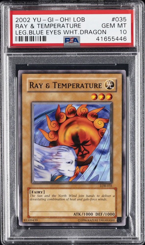 2002 YU-GI-OH! LOB-LEGEND OF BLUE EYES WHITE DRAGON #035 RAY & TEMPERATURE PSA 10 2002 YU-GI-OH! LOB-LEGEND OF BLUE EYES WHITE DRAGON #035 RAY & TEMPERATURE PSA 10 Purchase Info Thank you for your interest in this item consigned with PSA! By purchasing or making an offer on this item, you acknowledge and agree to the following terms: All sales are final. Returns not accepted. Payment must be made upon purchase of the item. All items are sold "as is" and without warranty of Collectors Universe, Inc. (d/b/a PSA), and ANY AND ALL IMPLIED WARRANTIES ARE DISCLAIMED AND EXCLUDED. Sales tax may apply depending on shipping address. PSA does not guarantee that another third-party grading company's authentication or certification of an item as genuine is correct or accurate. Neither a difference of opinion between third-party grading companies about authenticity, nor a company's subsequent reversal of its earlier authentication or certification of an item, will be a basis for rescinding a sale. Any dispute with another third-party grading company relating to the authenticity of an item must be resolved directly with that other company. Collectors' maximum liability in the event of loss or damage to an item during shipping will be the lesser of (a) the price paid for the item and (b) the change in fair market value of the item. You release Collectors from all other liability including for any claims of punitive damages, emotional distress, consequential damages, lost profits, or lost interest, except as prohibited by law. Shipping Purchased Items will be shipped directly from PSA Vault. You stay hands-free. PSA Vault When you purchase this item, you can save on sales tax and selling fees by keeping it in the PSA Vault, official Vault of eBay. Items already in PSA Vault and will be sent to PSA Vault will have no shipping charge Storage of any items with the PSA Vault will be subject to the PSA Vault Terms of Service. Consignment PSA has competitive rates on the world's largest collectibles marketplace with the option to list from the PSA Vault or immediately after PSA authentication and grading. Sale Price Under $100 $100 - $499 $500 - $999 $1,000 - $2,499 $2,500 - $4,999 $5,000+ Seller Fee 16% 14% 13% 10% 9% 7% Sellers pay a single fee as reflected above; no additional eBay fees are incurred. There is a $5 minimum fee on sold items.