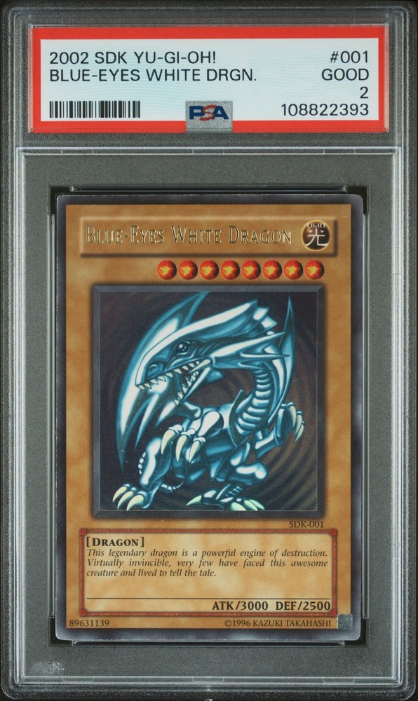 2002 YU-GI-OH! STARTER DECK: KAIBA #001 BLUE-EYES WHITE DRAGON PSA 2 2002 YU-GI-OH! STARTER DECK: KAIBA #001 BLUE-EYES WHITE DRAGON PSA 2 Purchase Info Thank you for your interest in this item consigned with PSA! By purchasing or making an offer on this item, you acknowledge and agree to the following terms: All sales are final. Returns not accepted. Payment must be made upon purchase of the item. All items are sold "as is" and without warranty of Collectors Universe, Inc. (d/b/a PSA), and ANY AND ALL IMPLIED WARRANTIES ARE DISCLAIMED AND EXCLUDED. Sales tax may apply depending on shipping address. PSA does not guarantee that another third-party grading company's authentication or certification of an item as genuine is correct or accurate. Neither a difference of opinion between third-party grading companies about authenticity, nor a company's subsequent reversal of its earlier authentication or certification of an item, will be a basis for rescinding a sale. Any dispute with another third-party grading company relating to the authenticity of an item must be resolved directly with that other company. Collectors' maximum liability in the event of loss or damage to an item during shipping will be the lesser of (a) the price paid for the item and (b) the change in fair market value of the item. You release Collectors from all other liability including for any claims of punitive damages, emotional distress, consequential damages, lost profits, or lost interest, except as prohibited by law. Shipping Purchased Items will be shipped directly from PSA Vault. You stay hands-free. PSA Vault When you purchase this item, you can save on sales tax and selling fees by keeping it in the PSA Vault, official Vault of eBay. Items already in PSA Vault and will be sent to PSA Vault will have no shipping charge Storage of any items with the PSA Vault will be subject to the PSA Vault Terms of Service. Consignment PSA has competitive rates on the world's largest collectibles marketplace with the option to list from the PSA Vault or immediately after PSA authentication and grading. Sale Price Under $100 $100 - $499 $500 - $999 $1,000 - $2,499 $2,500 - $4,999 $5,000+ Seller Fee 16% 14% 13% 10% 9% 7% Sellers pay a single fee as reflected above; no additional eBay fees are incurred. There is a $5 minimum fee on sold items.
