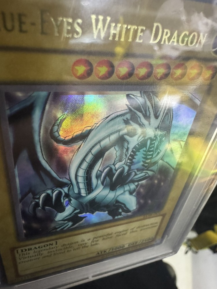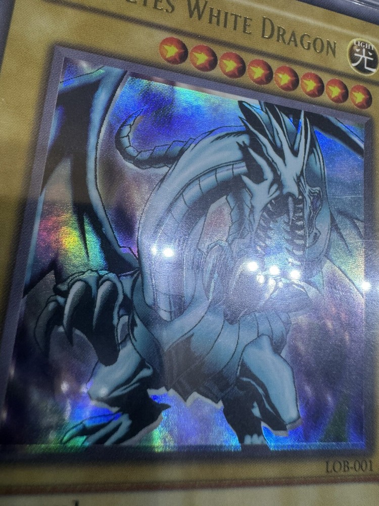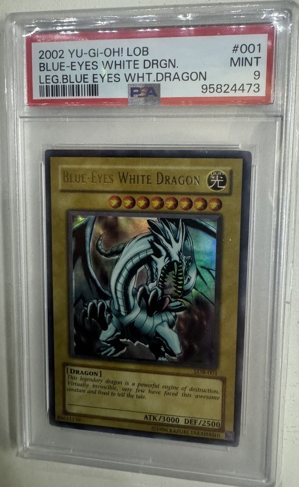 2002 Yu-Gi-Oh! LOB-001 Blue-eyes White Dragon PSA 9 MINT Yugioh card. This rare and highly sought-after card from the Yugi set features Dragons as its Creature/Monster Type. Manufactured by Konami, this holo card has a stunning finish and is in near mint or better condition. A must-have for any Yu-Gi-Oh! TCG collector, this iconic card is a true gem from 2002.