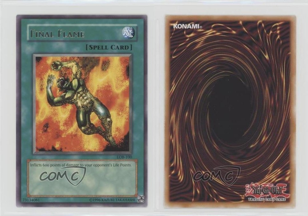 2002 Yu-Gi-Oh! Legend of Blue Eyes White Dragon - [Base] #LOB-100 Final Flame (R) COMC Item: 94574723 - YuGiOh Card - Featuring Final Flame Search for more: 2002 Yu-Gi-Oh! Legend of Blue Eyes White Dragon Search for more: 2002 Yu-Gi-Oh! Legend of Blue Eyes White Dragon - [Base] View all of our Listings Auctions Buy It Now About Us Located in the beautiful Pacific Northwest, COMC (Check Out My Cards) is the world's largest consignment service for trading card singles. More than 10,000 people have used our consignment service to list over 50 million trading cards. Find out how we can help you consign your items on eBay by contacting us through eBay messaging. COMC -- "The Safe & Easy Way to Buy & Sell" Raw Condition for Modern Cards Unless otherwise noted, raw modern cards are listed in Near Mint-Mint condition or better. A NM-MT card appears to be Mint at first glance, but upon closer inspection, may exhibit some of the following: minor print defects (e.g. roller marks, print line, dimple), minor scratches, slight edge wear, and slight corner wear. Centering is clearly visible in the images provided and does not factor into our condition assessment. Raw Condition for Vintage Cards Unless otherwise noted, raw vintage cards are listed in Excellent condition or better. An EX card may exhibit some of the following: minor rounding of corners, surface wear, print defects, light scratches, and slight edge wear/chipping. Centering is clearly visible in the images provided and does not factor into our condition assessment. Domestic Shipping Combined shipping for multiple items is available. To receive combined shipping, please ensure all desired items are in your eBay shopping cart before proceeding to checkout. eBay limits orders to 40 items per order. We automatically combine multiple orders placed on the same day. If you place multiple orders on the same day, please contact us to request a refund of applicable shipping costs. Signature confirmation may be required on invoices over $400. All cards are protected and shipped securely. International Shipping COMC offers eBay's International Shipping (EIS) for international orders under $2,500* (see country exceptions below). All duties and import fees are paid at checkout; in the rare event that there are additional import fees upon delivery, these are borne by the buyer. EIS packages route through a shipping hub in Erlanger, KY before shipping to their final destination. Please note that EIS does not allow for combined shipments. The shipping rates are determined by eBay and cannot be adjusted. *Maximum sale price exceptions: Colombia, Kuwait ($2,000); Taiwan ($1,539); Chile, Costa Rica, Guatemala, Honduras, Trinidad and Tobago ($1,000); Antigua and Barbuda, Aruba, Belize, Dominica, Grenada, Philippines, Saint Kitts and Nevis, Saint Lucia, Montserrat, Turks and Caicos Islands ($500); Dominican Republic, El Salvador ($200). Please request a shipping quote through eBay messaging for orders that exceed the maximum sale price supported by eBay's International Shipping. You will be responsible for all duties and import fees for international orders shipped outside the EIS. All cards are protected and shipped securely. Payment COMC does not accept offers on our cards through our eBay storefront. COMC utilizes eBay’s managed payments system. If you are experiencing difficulties making a payment, please contact eBay for assistance. Return Policy Returns are only accepted on the rare occasion the item is not as described. If you are making a return, please initiate the return process through eBay so a mailing label can be provided for you. Prior to listing, our expert team carefully assessed this item to represent it accurately. Please review the description and high-definition images prior to purchasing to ensure this item meets your satisfaction. We welcome you to contact us if you have further questions about this item. Trust and Integrity COMC carefully assesses each item consigned to us to prevent fraudulent items from entering the marketplace. If you believe an item offered on COMC may be fraudulent, please contact us with details so we can investigate the issue. Items we determine are outside our supported items policy may be removed. Last Modified: 7/6/2025 4:17:26 AM PDT