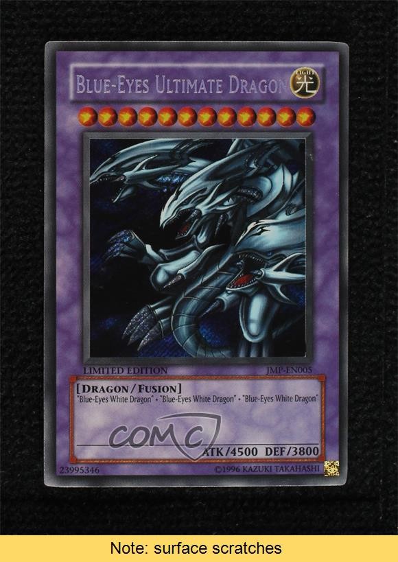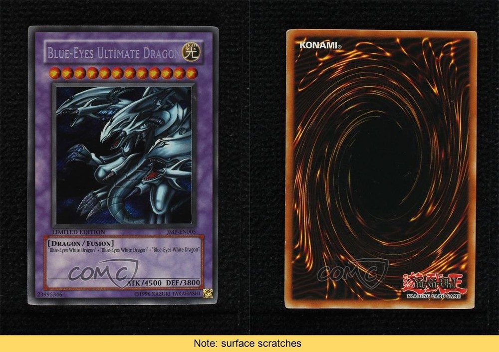 2002-19 Yu-Gi-Oh! Shonen Jump - Magazine Promo [Base] #JMP-EN005.1 SE - Blue-Eyes Ultimate Dragon COMC Item: 118302611 CONDITION NOTE: surface scratches - YuGiOh Card - Featuring Blue-Eyes Ultimate Dragon Search for more: 2002-19 Yu-Gi-Oh! Shonen Jump Search for more: 2002-19 Yu-Gi-Oh! Shonen Jump - Magazine Promo [Base] View all of our Listings Auctions Buy It Now About Us Located in the beautiful Pacific Northwest, COMC (Check Out My Cards) is the world's largest consignment service for trading card singles. More than 10,000 people have used our consignment service to list over 50 million trading cards. Find out how we can help you consign your items on eBay by contacting us through eBay messaging. COMC -- "The Safe & Easy Way to Buy & Sell" Raw Condition for Modern Cards Unless otherwise noted, raw modern cards are listed in Near Mint-Mint condition or better. A NM-MT card appears to be Mint at first glance, but upon closer inspection, may exhibit some of the following: minor print defects (e.g. roller marks, print line, dimple), minor scratches, slight edge wear, and slight corner wear. Centering is clearly visible in the images provided and does not factor into our condition assessment. Raw Condition for Vintage Cards Unless otherwise noted, raw vintage cards are listed in Excellent condition or better. An EX card may exhibit some of the following: minor rounding of corners, surface wear, print defects, light scratches, and slight edge wear/chipping. Centering is clearly visible in the images provided and does not factor into our condition assessment. Domestic Shipping Combined shipping for multiple items is available. To receive combined shipping, please ensure all desired items are in your eBay shopping cart before proceeding to checkout. eBay limits orders to 40 items per order. We automatically combine multiple orders placed on the same day. If you place multiple orders on the same day, please contact us to request a refund of applicable shipping costs. Signature confirmation may be required on invoices over $400. All cards are protected and shipped securely. International Shipping COMC offers eBay's International Shipping (EIS) for international orders under $2,500* (see country exceptions below). All duties and import fees are paid at checkout; in the rare event that there are additional import fees upon delivery, these are borne by the buyer. EIS packages route through a shipping hub in Erlanger, KY before shipping to their final destination. Please note that EIS does not allow for combined shipments. The shipping rates are determined by eBay and cannot be adjusted. *Maximum sale price exceptions: Colombia, Kuwait ($2,000); Taiwan ($1,539); Chile, Costa Rica, Guatemala, Honduras, Trinidad and Tobago ($1,000); Antigua and Barbuda, Aruba, Belize, Dominica, Grenada, Philippines, Saint Kitts and Nevis, Saint Lucia, Montserrat, Turks and Caicos Islands ($500); Dominican Republic, El Salvador ($200). Please request a shipping quote through eBay messaging for orders that exceed the maximum sale price supported by eBay's International Shipping. You will be responsible for all duties and import fees for international orders shipped outside the EIS. All cards are protected and shipped securely. Payment COMC does not accept offers on our cards through our eBay storefront. COMC utilizes eBay’s managed payments system. If you are experiencing difficulties making a payment, please contact eBay for assistance. Return Policy Returns are only accepted on the rare occasion the item is not as described. If you are making a return, please initiate the return process through eBay so a mailing label can be provided for you. Prior to listing, our expert team carefully assessed this item to represent it accurately. Please review the description and high-definition images prior to purchasing to ensure this item meets your satisfaction. We welcome you to contact us if you have further questions about this item. Trust and Integrity COMC carefully assesses each item consigned to us to prevent fraudulent items from entering the marketplace. If you believe an item offered on COMC may be fraudulent, please contact us with details so we can investigate the issue. Items we determine are outside our supported items policy may be removed. Last Modified: 7/1/2025 1:25:54 PM PDT