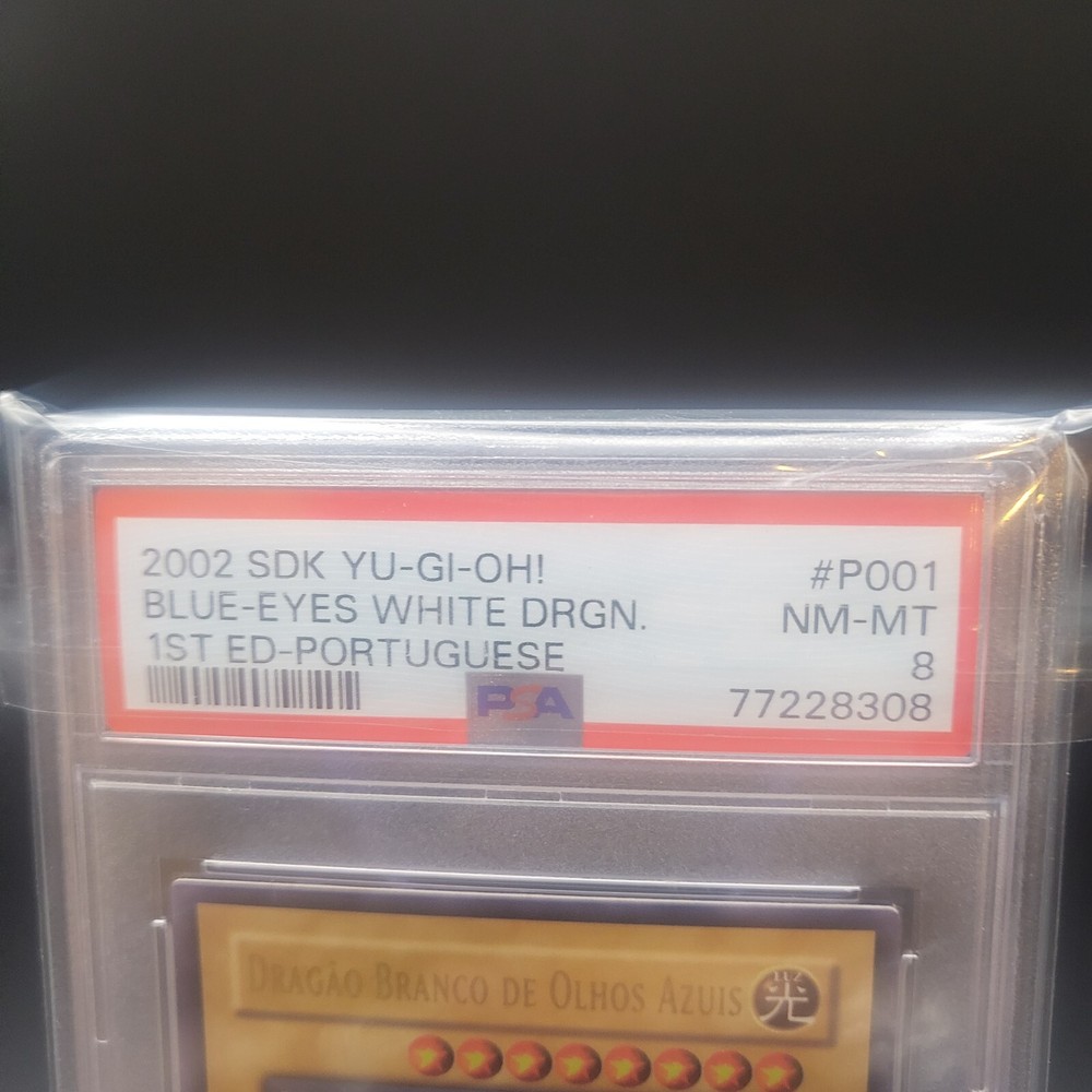 2002 Yugioh BLUE-EYES WHITE DRAGON SDK-001 DIK-P001 Portuguese 1st Edition PSA 8....