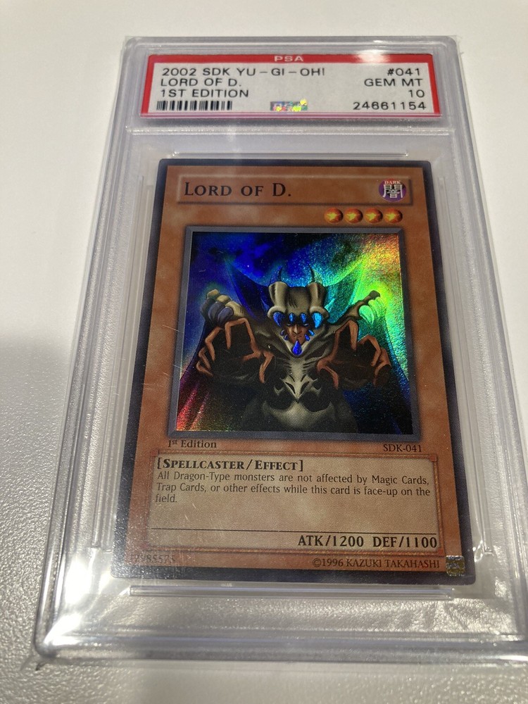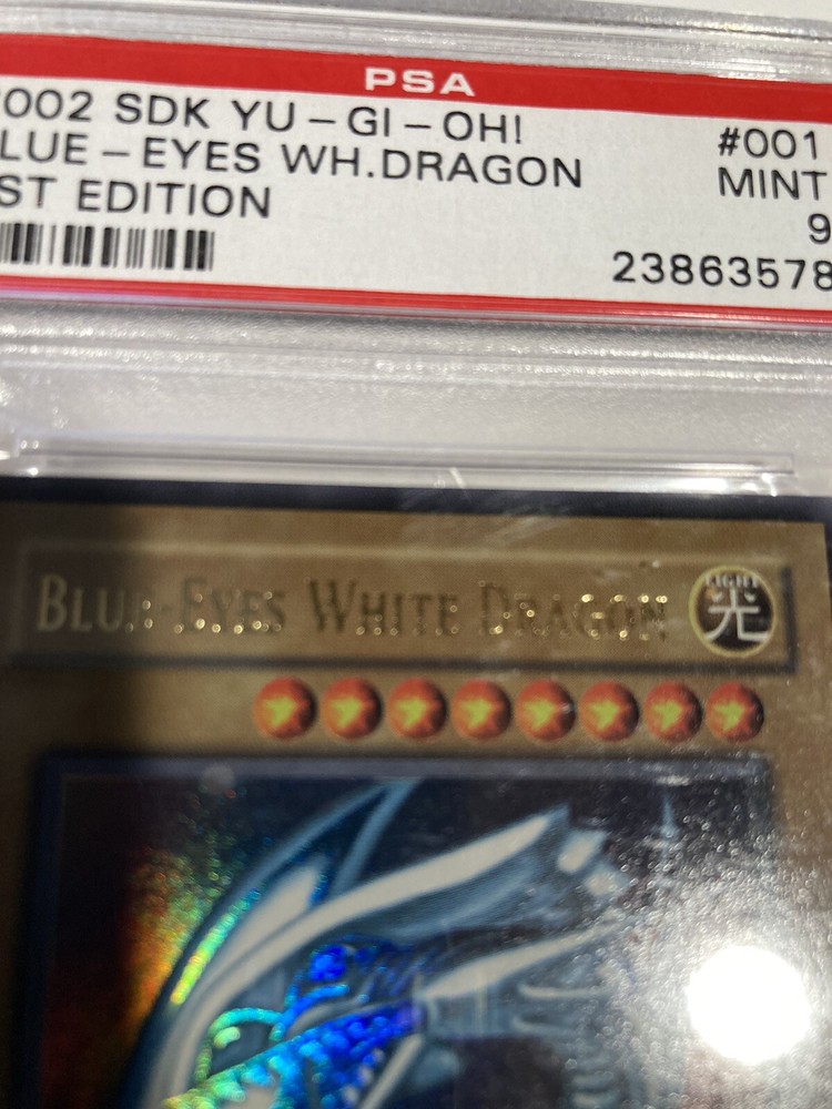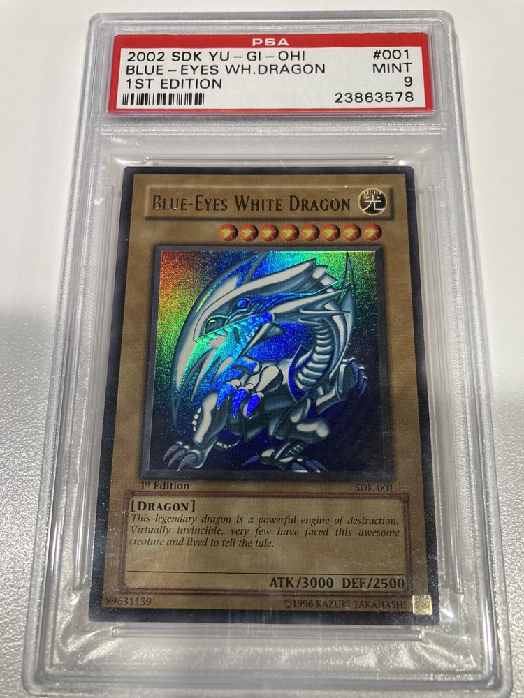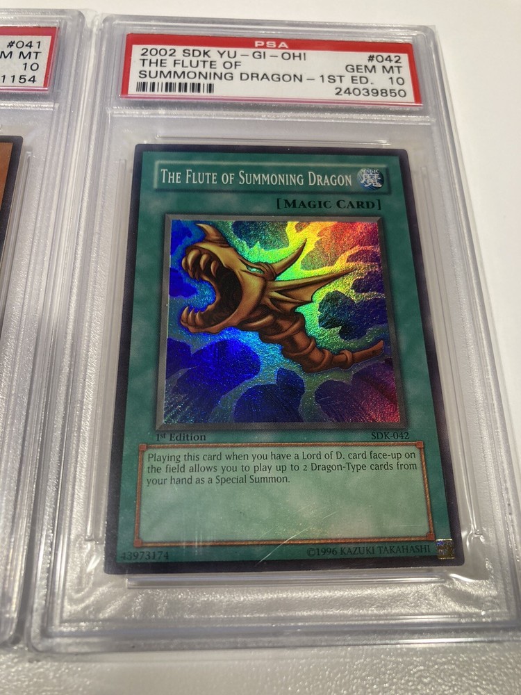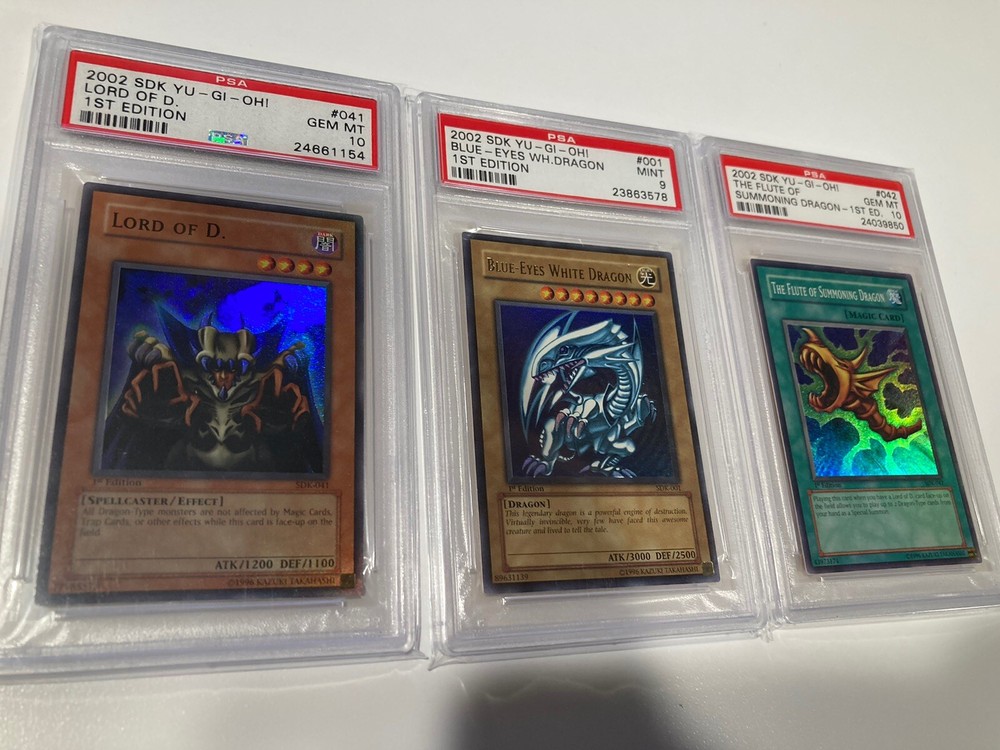 Up for sale is a lot of three (3) classic Yu-Gi-Oh Starter Deck Kaiba cards from the very beginning days of the game. The three cards were the ultra rare cards you would get from the starter deck. In this lot you get: - Blue Eyes White Dragon PSA 9, 1st edition (please note there seems to be a scratch inside the PSA case/slap at the top center above the card - please see pics. - Lord of D. PSA 10, 1st edition - Flute of Summoning Dragon PSA 10, 1st edition I will ship in a secure fashion. Rare find and a great collection item See pictures for details. Please reach out with questions Will pack well No returns and no refunds.