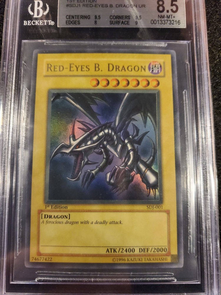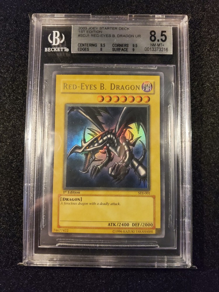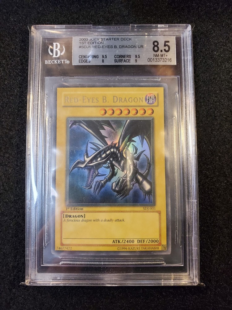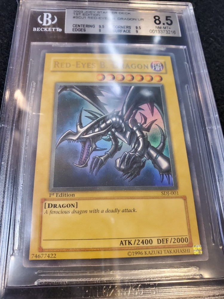 Red Eyes Black Dragon 1ST EDITION Ultra Rare Holo - BGS 8.5 NM - MINT+ Beckett Graded w/ Subgrades - 2003 SDJ-001 Starter Deck Joey - Classic Original YuGiOh TCG Card - PSA & CGC Equivalent Nice FADED card (especially the stars) - see pictures! Comes in clear protective sleeve as pictured, please refer to pictures of exact item for overall condition. Combined and expedited shipping available, please message me so I can send an invoice. Check out my other items for sale and let me know if you have any questions, thank you! Click HERE to check out my other items!