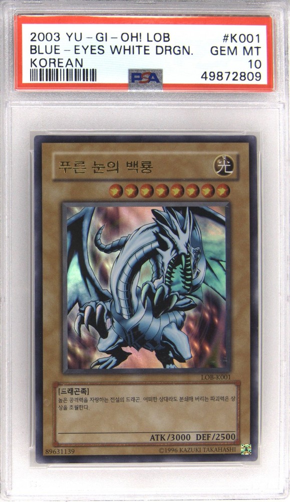 2003 YU-GI-OH! LEGEND OF BLUE EYES WHITE DRAGON KOREAN #K001 BLUE-EYES WHITE DRAGON PSA 10 2003 YU-GI-OH! LEGEND OF BLUE EYES WHITE DRAGON KOREAN #K001 BLUE-EYES WHITE DRAGON PSA 10 Purchase Info Thank you for your interest in this item consigned with PSA! By purchasing or making an offer on this item, you acknowledge and agree to the following terms: All sales are final. Returns not accepted. Payment must be made upon purchase of the item. All items are sold "as is" and without warranty of Collectors Universe, Inc. (d/b/a PSA), and ANY AND ALL IMPLIED WARRANTIES ARE DISCLAIMED AND EXCLUDED. Sales tax may apply depending on shipping address. PSA does not guarantee that another third-party grading company's authentication or certification of an item as genuine is correct or accurate. Neither a difference of opinion between third-party grading companies about authenticity, nor a company's subsequent reversal of its earlier authentication or certification of an item, will be a basis for rescinding a sale. Any dispute with another third-party grading company relating to the authenticity of an item must be resolved directly with that other company. Collectors' maximum liability in the event of loss or damage to an item during shipping will be the lesser of (a) the price paid for the item and (b) the change in fair market value of the item. You release Collectors from all other liability including for any claims of punitive damages, emotional distress, consequential damages, lost profits, or lost interest, except as prohibited by law. Shipping Purchased Items will be shipped directly from PSA Vault. You stay hands-free. PSA Vault When you purchase this item, you can save on sales tax and selling fees by keeping it in the PSA Vault, official Vault of eBay. Items already in PSA Vault and will be sent to PSA Vault will have no shipping charge Storage of any items with the PSA Vault will be subject to the PSA Vault Terms of Service. Consignment PSA has competitive rates on the world's largest collectibles marketplace with the option to list from the PSA Vault or immediately after PSA authentication and grading. Sale Price Under $100 $100 - $499 $500 - $999 $1,000 - $2,499 $2,500 - $4,999 $5,000+ Seller Fee 16% 14% 13% 10% 9% 7% Sellers pay a single fee as reflected above; no additional eBay fees are incurred. There is a $5 minimum fee on sold items.