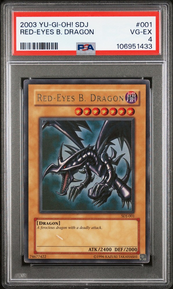 2003 YU-GI-OH! STARTER DECK: JOEY #001 RED-EYES B. DRAGON PSA 4 2003 YU-GI-OH! STARTER DECK: JOEY #001 RED-EYES B. DRAGON PSA 4 Purchase Info Thank you for your interest in this item consigned with PSA! By purchasing or making an offer on this item, you acknowledge and agree to the following terms: All sales are final. Returns not accepted. Payment must be made upon purchase of the item. All items are sold "as is" and without warranty of Collectors Universe, Inc. (d/b/a PSA), and ANY AND ALL IMPLIED WARRANTIES ARE DISCLAIMED AND EXCLUDED. Sales tax may apply depending on shipping address. PSA does not guarantee that another third-party grading company's authentication or certification of an item as genuine is correct or accurate. Neither a difference of opinion between third-party grading companies about authenticity, nor a company's subsequent reversal of its earlier authentication or certification of an item, will be a basis for rescinding a sale. Any dispute with another third-party grading company relating to the authenticity of an item must be resolved directly with that other company. Collectors' maximum liability in the event of loss or damage to an item during shipping will be the lesser of (a) the price paid for the item and (b) the change in fair market value of the item. You release Collectors from all other liability including for any claims of punitive damages, emotional distress, consequential damages, lost profits, or lost interest, except as prohibited by law. Shipping Purchased Items will be shipped directly from PSA Vault. You stay hands-free. PSA Vault When you purchase this item, you can save on sales tax and selling fees by keeping it in the PSA Vault, official Vault of eBay. Items already in PSA Vault and will be sent to PSA Vault will have no shipping charge Storage of any items with the PSA Vault will be subject to the PSA Vault Terms of Service. Consignment PSA has competitive rates on the world's largest collectibles marketplace with the option to list from the PSA Vault or immediately after PSA authentication and grading. Sale Price Under $100 $100 - $499 $500 - $999 $1,000 - $2,499 $2,500 - $4,999 $5,000+ Seller Fee 16% 14% 13% 10% 9% 7% Sellers pay a single fee as reflected above; no additional eBay fees are incurred. There is a $5 minimum fee on sold items.