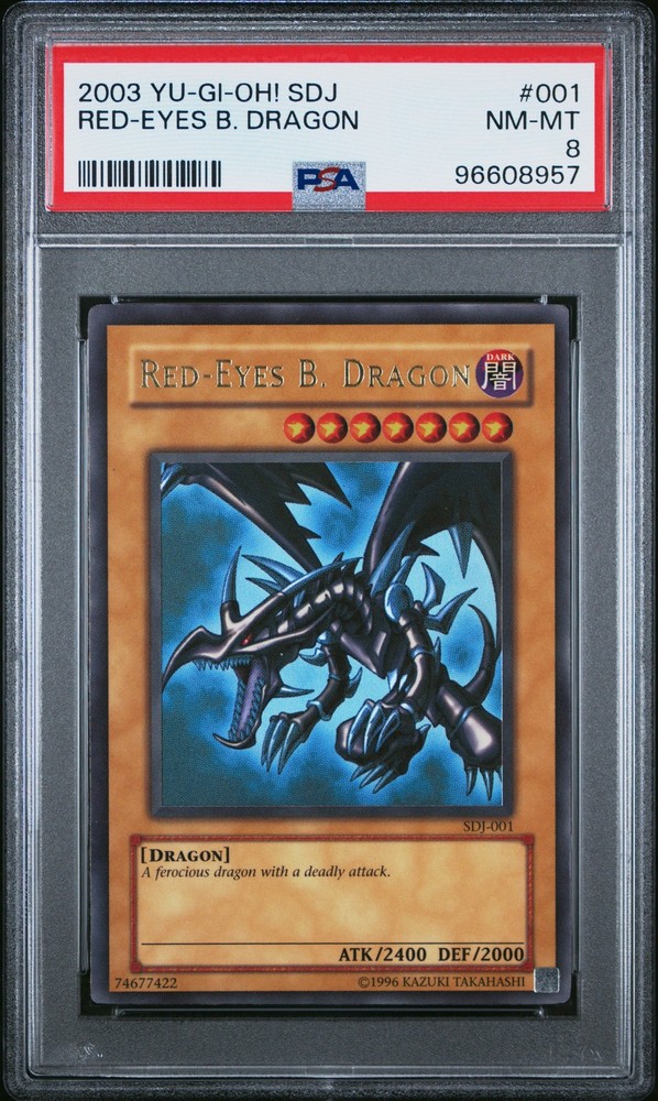 2003 YU-GI-OH! STARTER DECK: JOEY #001 RED-EYES B. DRAGON PSA 8 2003 YU-GI-OH! STARTER DECK: JOEY #001 RED-EYES B. DRAGON PSA 8 Purchase Info Thank you for your interest in this item consigned with PSA! By purchasing or making an offer on this item, you acknowledge and agree to the following terms: All sales are final. Returns not accepted. Payment must be made upon purchase of the item. All items are sold "as is" and without warranty of Collectors Universe, Inc. (d/b/a PSA), and ANY AND ALL IMPLIED WARRANTIES ARE DISCLAIMED AND EXCLUDED. Sales tax may apply depending on shipping address. PSA does not guarantee that another third-party grading company's authentication or certification of an item as genuine is correct or accurate. Neither a difference of opinion between third-party grading companies about authenticity, nor a company's subsequent reversal of its earlier authentication or certification of an item, will be a basis for rescinding a sale. Any dispute with another third-party grading company relating to the authenticity of an item must be resolved directly with that other company. Collectors' maximum liability in the event of loss or damage to an item during shipping will be the lesser of (a) the price paid for the item and (b) the change in fair market value of the item. You release Collectors from all other liability including for any claims of punitive damages, emotional distress, consequential damages, lost profits, or lost interest, except as prohibited by law. Shipping Purchased Items will be shipped directly from PSA Vault. You stay hands-free. PSA Vault When you purchase this item, you can save on sales tax and selling fees by keeping it in the PSA Vault, official Vault of eBay. Items already in PSA Vault and will be sent to PSA Vault will have no shipping charge Storage of any items with the PSA Vault will be subject to the PSA Vault Terms of Service. Consignment PSA has competitive rates on the world's largest collectibles marketplace with the option to list from the PSA Vault or immediately after PSA authentication and grading. Sale Price Under $100 $100 - $499 $500 - $999 $1,000 - $2,499 $2,500 - $4,999 $5,000+ Seller Fee 16% 14% 13% 10% 9% 7% Sellers pay a single fee as reflected above; no additional eBay fees are incurred. There is a $5 minimum fee on sold items.