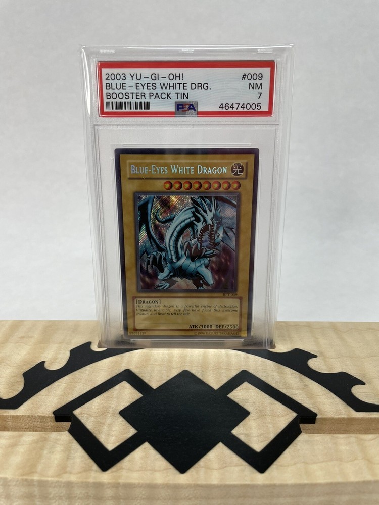 2003 Yu-Gi-Oh Booster Pack Tin Blue Eyes White Dragon BPT-009 NM PSA 7. Slab protected in sleeve and shipped with care. Shipped with USPS First Class.