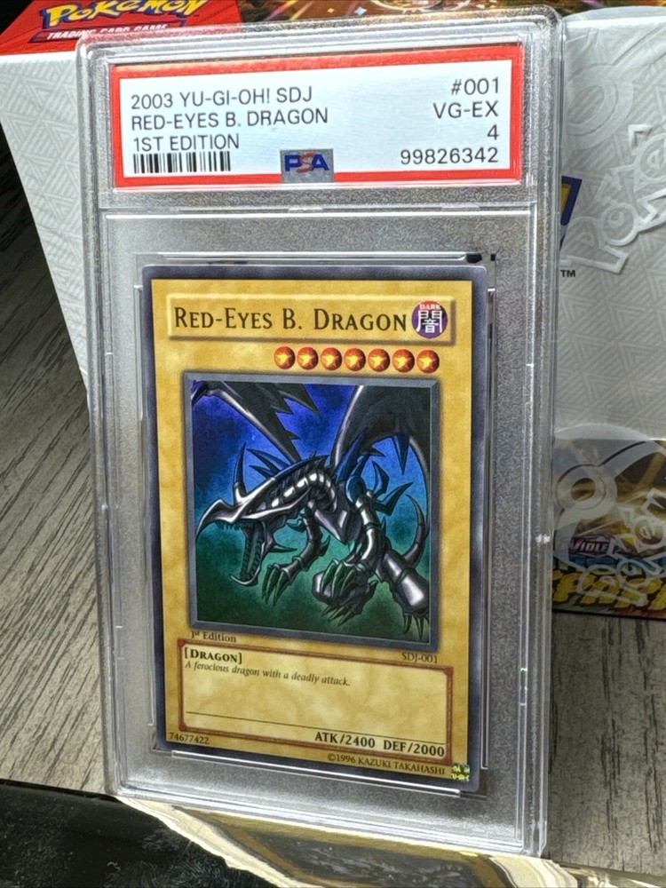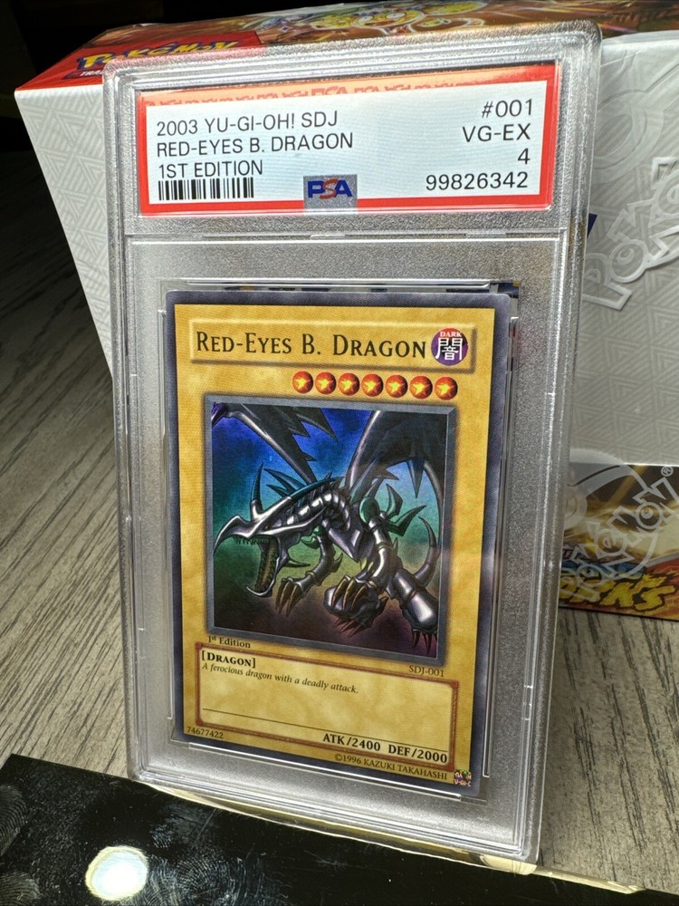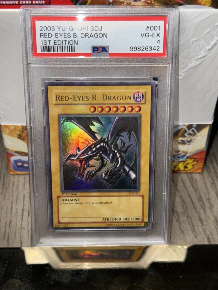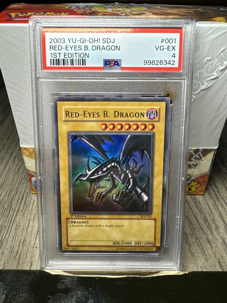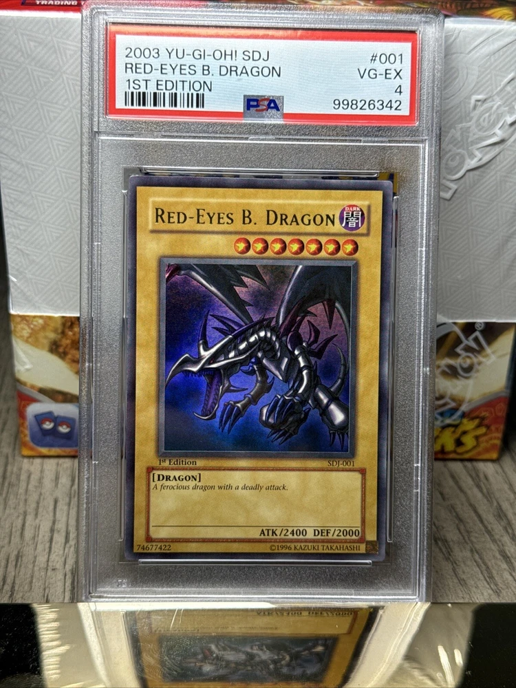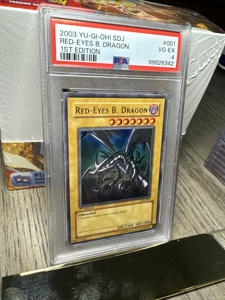 The product is a 2003 Yu-Gi-Oh! TCG Red Eyes Black Dragon 1st Edition card from the Joey starter deck, graded PSA 4. This collectible card game item features a sought-after card with the iconic Red Eyes Black Dragon, manufactured in 2003.
