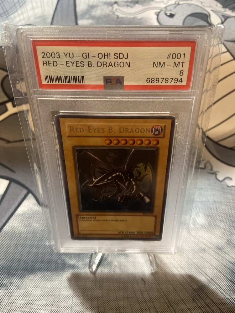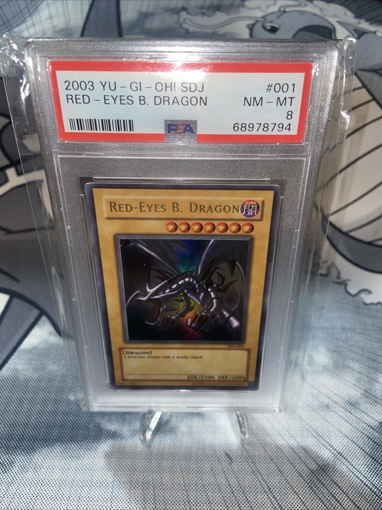This 2003 Yu-Gi-Oh! SDJ #001 Red Eyes Black Dragon card is a highly sought-after Ultra Rare collectible. The card features a holographic finish and is from the Joey set. It is a Monster card with the card number 001 and was manufactured by Konami. The card name is Red-Eyes Black Dragon and it is a must-have for any serious Yu-Gi-Oh! TCG collector. The card is in excellent shape and has been graded PSA 8 NEAR MINT. It is perfect for adding to your collection or for use in competitive play.