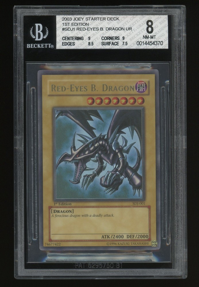 2003 Yu-Gi-Oh! SDJ-001 Red Eyes Black Dragon BGS 8 1st Edition. CONDITION: For raw cards, the condition is EX-NM+ depending on the year and manufacturer of the item. Almost all of the raw cards listed have been in sleeves and/or top loaders and boxes for a year up to a decade. Some cards may have surface dimples, imprints, or minor printing scratches. The cards may have whiting on edges, stains, whiting on corners, dull corners or edges, etc. please see scans to help judge the condition of the card listed. For Panini Mosaic Cards: The quality control on these cards is low from Panini. Some cards seem to have some type of adhesive or dried substance on the surfaces (from factory packaging). These cards should be expected to have some sort of issue from minor surface dimples to substances on the surface. If there are any questions about a specific card or possible factory wear on the card please reach out. For Thick Stock Cards/Relics: almost if not all thick stock cards are damaged on edges or corners during manufacturing/packaging. Any thick stock cards listed on this account are expected to have possibly damaged edges or other minor defects. For Slabs: slab companies are known for their low quality control and customer service. BGS slabs are known for easily chipping, scratching, and other minor defects. PSA slabs may also have minor scratches, marks, or minor defects as well. Please analyze the scan of the slab before purchasing. That being said, PSA slabs may hold similar defects as well. If you have any questions about the item(s) listed, please let me know. SHIPPING: Shipping is free! Any card sale $20 or less will be shipped through eBay’s $20 or less envelopes in a sleeve and/or top loader. Any slabs or raw cards sold over $20 will be shipped in bubble mailers through USPS with tracking. All cards will be shipped within one business day of payment being received. RETURNS: Returns are not accepted for this item. Thank You!