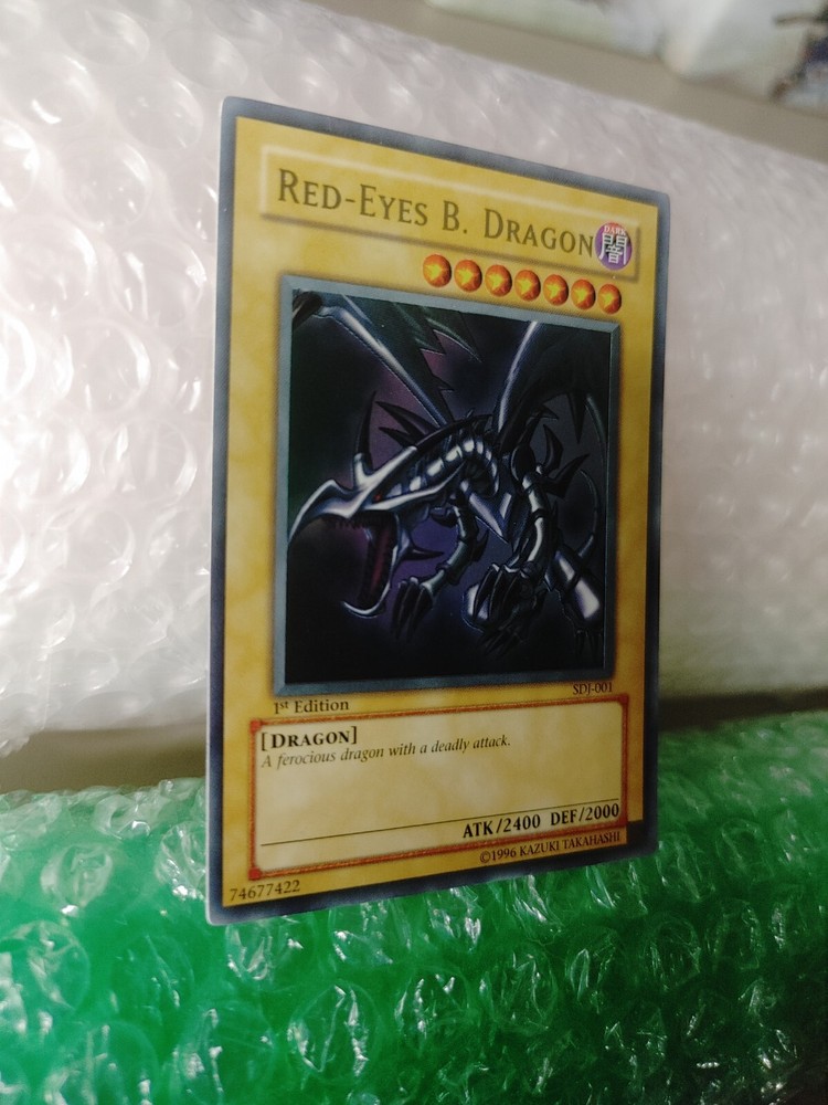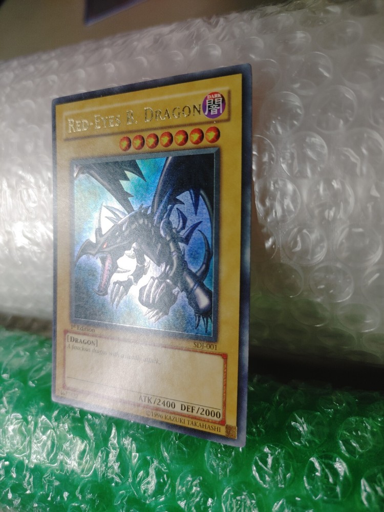 The 2003 Yugioh Red Eyes Black Dragon SDJ-001 1st Edition is a highly sought-after collectible card from the Yu-Gi-Oh! Trading Card Game. This Ultra Rare card features the iconic character Joey Wheeler's signature monster, the powerful Dragon-type Red Eyes Black Dragon. Manufactured by Konami in the United States, this holo card is made of card stock and showcases a Dark color scheme. It is a valuable addition to any Yu-Gi-Oh! card collection, especially for fans of the Red Eyes Black Dragon and Joey Wheeler. Beautiful card! Great condition! Easily gradable! Top loader, bubble wrap,and extra cardboard for protection!
