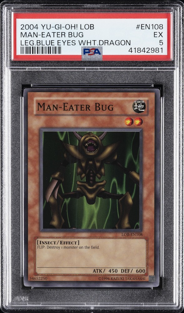 2004 YU-GI-OH! LOB-LEGEND OF BLUE EYES WHITE DRAGON #EN108 MAN-EATER BUG PSA 5 2004 YU-GI-OH! LOB-LEGEND OF BLUE EYES WHITE DRAGON #EN108 MAN-EATER BUG PSA 5 Purchase Info Thank you for your interest in this item consigned with PSA! By purchasing or making an offer on this item, you acknowledge and agree to the following terms: All sales are final. Returns not accepted. Payment must be made upon purchase of the item. All items are sold "as is" and without warranty of Collectors Universe, Inc. (d/b/a PSA), and ANY AND ALL IMPLIED WARRANTIES ARE DISCLAIMED AND EXCLUDED. Sales tax may apply depending on shipping address. PSA does not guarantee that another third-party grading company's authentication or certification of an item as genuine is correct or accurate. Neither a difference of opinion between third-party grading companies about authenticity, nor a company's subsequent reversal of its earlier authentication or certification of an item, will be a basis for rescinding a sale. Any dispute with another third-party grading company relating to the authenticity of an item must be resolved directly with that other company. Collectors' maximum liability in the event of loss or damage to an item during shipping will be the lesser of (a) the price paid for the item and (b) the change in fair market value of the item. You release Collectors from all other liability including for any claims of punitive damages, emotional distress, consequential damages, lost profits, or lost interest, except as prohibited by law. Shipping Purchased Items will be shipped directly from PSA Vault. You stay hands-free. PSA Vault When you purchase this item, you can save on sales tax and selling fees by keeping it in the PSA Vault, official Vault of eBay. Items already in PSA Vault and will be sent to PSA Vault will have no shipping charge Storage of any items with the PSA Vault will be subject to the PSA Vault Terms of Service. Consignment PSA has competitive rates on the world's largest collectibles marketplace with the option to list from the PSA Vault or immediately after PSA authentication and grading. Sale Price Under $100 $100 - $499 $500 - $999 $1,000 - $2,499 $2,500 - $4,999 $5,000+ Seller Fee 16% 14% 13% 10% 9% 7% Sellers pay a single fee as reflected above; no additional eBay fees are incurred. There is a $5 minimum fee on sold items.