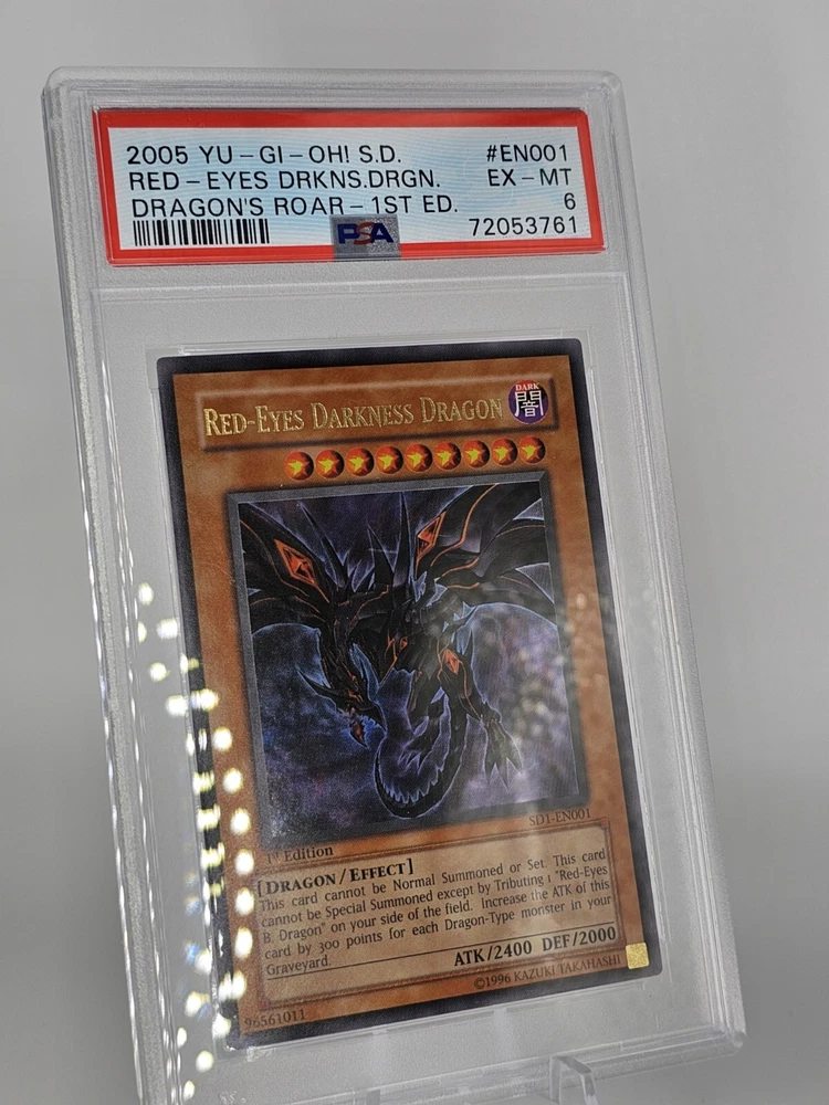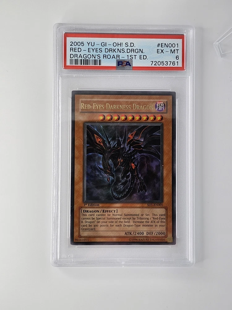 2005 YU-GI-Oh! SD Dragon's Roar EN001 Red-Eyes Darkness Dragon 1st Edition PSA 6. Fresh from PSA. The card you see are the card you will be shipped.