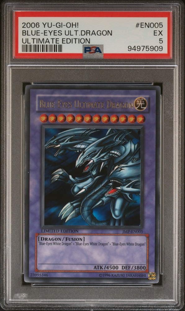 2006 YU-GI-OH! ULTIMATE EDITION #EN005 BLUE-EYES ULTIMATE DRAGON PSA 5 2006 YU-GI-OH! ULTIMATE EDITION #EN005 BLUE-EYES ULTIMATE DRAGON PSA 5 Purchase Info Thank you for your interest in this item consigned with PSA! By purchasing or making an offer on this item, you acknowledge and agree to the following terms: All sales are final. Returns not accepted. Payment must be made upon purchase of the item. All items are sold "as is" and without warranty of Collectors Universe, Inc. (d/b/a PSA), and ANY AND ALL IMPLIED WARRANTIES ARE DISCLAIMED AND EXCLUDED. Sales tax may apply depending on shipping address. PSA does not guarantee that another third-party grading company's authentication or certification of an item as genuine is correct or accurate. Neither a difference of opinion between third-party grading companies about authenticity, nor a company's subsequent reversal of its earlier authentication or certification of an item, will be a basis for rescinding a sale. Any dispute with another third-party grading company relating to the authenticity of an item must be resolved directly with that other company. Collectors' maximum liability in the event of loss or damage to an item during shipping will be the lesser of (a) the price paid for the item and (b) the change in fair market value of the item. You release Collectors from all other liability including for any claims of punitive damages, emotional distress, consequential damages, lost profits, or lost interest, except as prohibited by law. Shipping Purchased Items will be shipped directly from PSA Vault. You stay hands-free. PSA Vault When you purchase this item, you can save on sales tax and selling fees by keeping it in the PSA Vault, official Vault of eBay. Items already in PSA Vault and will be sent to PSA Vault will have no shipping charge Storage of any items with the PSA Vault will be subject to the PSA Vault Terms of Service. Consignment PSA has competitive rates on the world's largest collectibles marketplace with the option to list from the PSA Vault or immediately after PSA authentication and grading. Sale Price Under $100 $100 - $499 $500 - $999 $1,000 - $2,499 $2,500 - $4,999 $5,000+ Seller Fee 16% 14% 13% 10% 9% 7% Sellers pay a single fee as reflected above; no additional eBay fees are incurred. There is a $5 minimum fee on sold items.