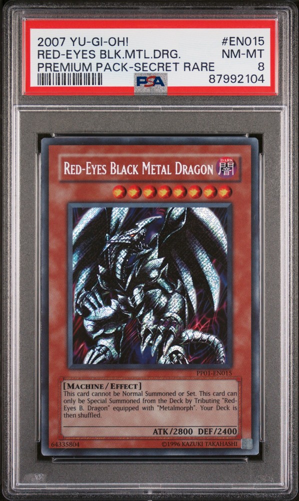 Description Condition: PSA 8 NM-MT Availability: In Stock You are Purchasing 2007 YUGIOH PP01-EN015 RED-EYES BLACK METAL DRAGON SECRET PSA 8 NM #87992104 Professionally graded by Professional Sports Authenticator (PSA) *PLEASE REVIEW PHOTO(S) BEFORE PURCHASING >>MORE GRADED YUGIOH CARDS<< Payment Options Payment is expected within 7 days of your purchase date. We accept all forms of payments through Paypal. Shipping and Handling We ship to all U.S. states, U.S. territories, APO/FPO locations and any international countries listed under our "ship to" heading. Shipping and Handling is calculated based on the combined shipping weight of your item(s). Please use the shipping calculator to estimate your shipping and handling charges. In order to qualify for combined shipping terms, all items must be paid for in one payment; please do not pay until you are done bidding/shopping. Please contact us if you have any questions regarding our shipping and handling terms. Shipping and Delivery Packages are shipped out every Monday, Wednesday, and Friday. Domestic Packages take approximately 2-7 days to arrive. International packages may take a little longer to arrive, typically 1-4 weeks. Please allow ample transit times before inquiring about your package, thank you. Sales Tax All orders shipped to a California address will be subject to Sales Tax. Sales Tax is calculated on the item's price and is not applied to the shipping or other charges. Customer Service We will make every effort to get your purchase is mailed in a timely manner. Please contact us if you have any questions or concerns; we would love to hear any suggestions you have on how we can improve your eBay experience. Thank you for visiting us today.
