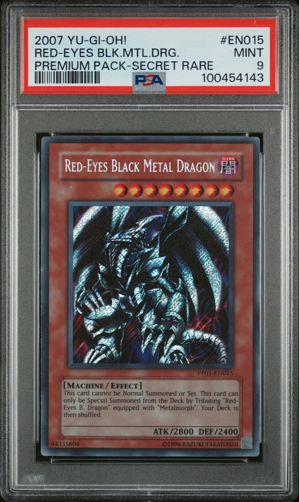 Description Condition: PSA 9 MINT Availability: In Stock You are Purchasing 2007 YUGIOH PP01-EN015 RED-EYES BLACK METAL DRAGON SECRET PSA 9 MINT #100454144 Professionally graded by Professional Sports Authenticator (PSA) *PLEASE REVIEW PHOTO(S) BEFORE PURCHASING >>MORE GRADED YUGIOH CARDS<< Payment Options Payment is expected within 7 days of your purchase date. We accept all forms of payments through Paypal. Shipping and Handling We ship to all U.S. states, U.S. territories, APO/FPO locations and any international countries listed under our "ship to" heading. Shipping and Handling is calculated based on the combined shipping weight of your item(s). Please use the shipping calculator to estimate your shipping and handling charges. In order to qualify for combined shipping terms, all items must be paid for in one payment; please do not pay until you are done bidding/shopping. Please contact us if you have any questions regarding our shipping and handling terms. Shipping and Delivery Packages are shipped out every Monday, Wednesday, and Friday. Domestic Packages take approximately 2-7 days to arrive. International packages may take a little longer to arrive, typically 1-4 weeks. Please allow ample transit times before inquiring about your package, thank you. Sales Tax All orders shipped to a California address will be subject to Sales Tax. Sales Tax is calculated on the item's price and is not applied to the shipping or other charges. Customer Service We will make every effort to get your purchase is mailed in a timely manner. Please contact us if you have any questions or concerns; we would love to hear any suggestions you have on how we can improve your eBay experience. Thank you for visiting us today.