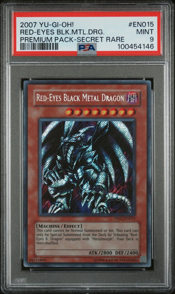 Description Condition: PSA 9 MINT Availability: In Stock You are Purchasing 2007 YUGIOH PP01-EN015 RED-EYES BLACK METAL DRAGON SECRET PSA 9 MINT #100454146 Professionally graded by Professional Sports Authenticator (PSA) *PLEASE REVIEW PHOTO(S) BEFORE PURCHASING >>MORE GRADED YUGIOH CARDS<< Payment Options Payment is expected within 7 days of your purchase date. We accept all forms of payments through Paypal. Shipping and Handling We ship to all U.S. states, U.S. territories, APO/FPO locations and any international countries listed under our "ship to" heading. Shipping and Handling is calculated based on the combined shipping weight of your item(s). Please use the shipping calculator to estimate your shipping and handling charges. In order to qualify for combined shipping terms, all items must be paid for in one payment; please do not pay until you are done bidding/shopping. Please contact us if you have any questions regarding our shipping and handling terms. Shipping and Delivery Packages are shipped out every Monday, Wednesday, and Friday. Domestic Packages take approximately 2-7 days to arrive. International packages may take a little longer to arrive, typically 1-4 weeks. Please allow ample transit times before inquiring about your package, thank you. Sales Tax All orders shipped to a California address will be subject to Sales Tax. Sales Tax is calculated on the item's price and is not applied to the shipping or other charges. Customer Service We will make every effort to get your purchase is mailed in a timely manner. Please contact us if you have any questions or concerns; we would love to hear any suggestions you have on how we can improve your eBay experience. Thank you for visiting us today.