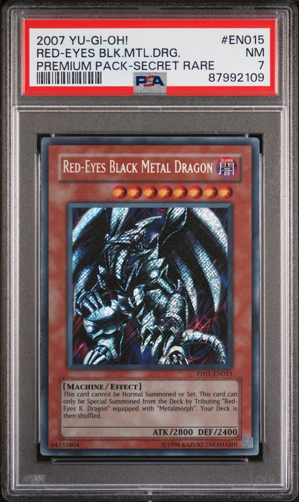 Description Condition: PSA 7 NM Availability: In Stock You are Purchasing 2007 YUGIOH PP01-EN015 RED-EYES BLACK METAL DRAGON SECRET RARE SA 7 NM #87992109 Professionally graded by Professional Sports Authenticator (PSA) *PLEASE REVIEW PHOTO(S) BEFORE PURCHASING >>MORE GRADED YUGIOH CARDS<< Payment Options Payment is expected within 7 days of your purchase date. We accept all forms of payments through Paypal. Shipping and Handling We ship to all U.S. states, U.S. territories, APO/FPO locations and any international countries listed under our "ship to" heading. Shipping and Handling is calculated based on the combined shipping weight of your item(s). Please use the shipping calculator to estimate your shipping and handling charges. In order to qualify for combined shipping terms, all items must be paid for in one payment; please do not pay until you are done bidding/shopping. Please contact us if you have any questions regarding our shipping and handling terms. Shipping and Delivery Packages are shipped out every Monday, Wednesday, and Friday. Domestic Packages take approximately 2-7 days to arrive. International packages may take a little longer to arrive, typically 1-4 weeks. Please allow ample transit times before inquiring about your package, thank you. Sales Tax All orders shipped to a California address will be subject to Sales Tax. Sales Tax is calculated on the item's price and is not applied to the shipping or other charges. Customer Service We will make every effort to get your purchase is mailed in a timely manner. Please contact us if you have any questions or concerns; we would love to hear any suggestions you have on how we can improve your eBay experience. Thank you for visiting us today.