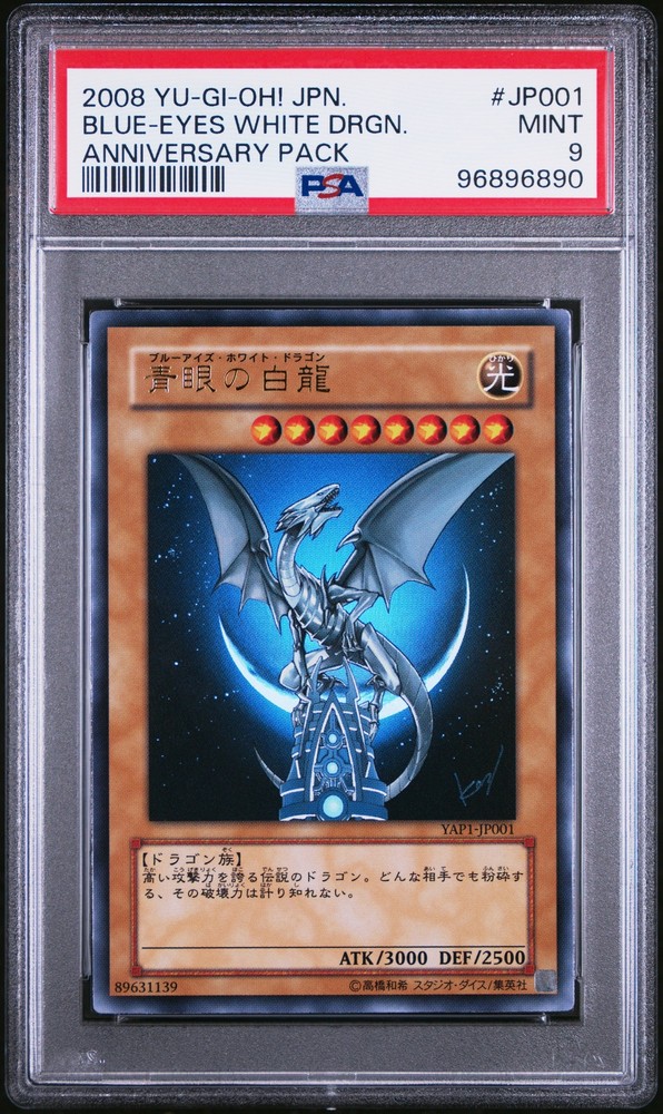 2008 YU-GI-OH! JAPANESE YAP1-ANNIVERSARY PACK #JP001 BLUE-EYES WHITE DRAGON PSA 9 2008 YU-GI-OH! JAPANESE YAP1-ANNIVERSARY PACK #JP001 BLUE-EYES WHITE DRAGON PSA 9 Purchase Info Thank you for your interest in this item consigned with PSA! By purchasing or making an offer on this item, you acknowledge and agree to the following terms: All sales are final. Returns not accepted. Payment must be made upon purchase of the item. All items are sold "as is" and without warranty of Collectors Universe, Inc. (d/b/a PSA), and ANY AND ALL IMPLIED WARRANTIES ARE DISCLAIMED AND EXCLUDED. Sales tax may apply depending on shipping address. PSA does not guarantee that another third-party grading company's authentication or certification of an item as genuine is correct or accurate. Neither a difference of opinion between third-party grading companies about authenticity, nor a company's subsequent reversal of its earlier authentication or certification of an item, will be a basis for rescinding a sale. Any dispute with another third-party grading company relating to the authenticity of an item must be resolved directly with that other company. Collectors' maximum liability in the event of loss or damage to an item during shipping will be the lesser of (a) the price paid for the item and (b) the change in fair market value of the item. You release Collectors from all other liability including for any claims of punitive damages, emotional distress, consequential damages, lost profits, or lost interest, except as prohibited by law. Shipping Purchased Items will be shipped directly from PSA Vault. You stay hands-free. PSA Vault When you purchase this item, you can save on sales tax and selling fees by keeping it in the PSA Vault, official Vault of eBay. Items already in PSA Vault and will be sent to PSA Vault will have no shipping charge Storage of any items with the PSA Vault will be subject to the PSA Vault Terms of Service. Consignment PSA has competitive rates on the world's largest collectibles marketplace with the option to list from the PSA Vault or immediately after PSA authentication and grading. Sale Price Under $100 $100 - $499 $500 - $999 $1,000 - $2,499 $2,500 - $4,999 $5,000+ Seller Fee 16% 14% 13% 10% 9% 7% Sellers pay a single fee as reflected above; no additional eBay fees are incurred. There is a $5 minimum fee on sold items.