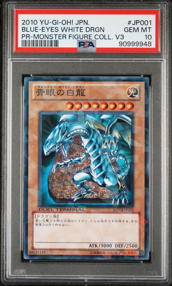 2010 YU-GI-OH! JAPANESE PROMO MONSTER FIGURE COLLECTION VOLUME 3 #JP001 BLUE-EYES WHITE DRAGON PSA 10 2010 YU-GI-OH! JAPANESE PROMO MONSTER FIGURE COLLECTION VOLUME 3 #JP001 BLUE-EYES WHITE DRAGON PSA 10 Purchase Info Thank you for your interest in bidding on this item consigned with PSA! By bidding on this item, you acknowledge and agree to the following terms: All sales are final. Returns not accepted. Payment must be made within 7 days of auction close. All items are sold "as is" and without warranty of Collectors Universe, Inc. (d/b/a PSA), and ANY AND ALL IMPLIED WARRANTIES ARE DISCLAIMED AND EXCLUDED. Sales tax may apply depending on shipping address. PSA does not guarantee that another third-party grading company's authentication or certification of an item as genuine is correct or accurate. Neither a difference of opinion between third-party grading companies about authenticity, nor a company's subsequent reversal of its earlier authentication or certification of an item, will be a basis for rescinding a sale. Any dispute with another third-party grading company relating to the authenticity of an item must be resolved directly with that other company. Collectors' maximum liability in the event of loss or damage to an item during shipping will be the lesser of (a) the price paid for the item and (b) the change in fair market value of the item. You release Collectors from all other liability including for any claims of punitive damages, emotional distress, consequential damages, lost profits, or lost interest, except as prohibited by law. Shipping Purchased Items will be shipped directly from PSA Vault. You stay hands-free. PSA Vault When you purchase this item, you can save on sales tax and selling fees by keeping it in the PSA Vault, official Vault of eBay. Items already in PSA Vault and will be sent to PSA Vault will have no shipping charge Storage of any items with the PSA Vault will be subject to the PSA Vault Terms of Service. Consignment PSA has competitive auction rates on the world's largest collectibles marketplace with the option to list from the PSA Vault or immediately after PSA authentication and grading. Sale Price Under $100 $100 - $499 $500 - $999 $1,000 - $2,499 $2,500 - $4,999 $5,000+ Seller Fee 13% + $3 flat 13% 12% 10% 9% 7% Sellers pay a single fee as reflected above; no additional eBay fees are incurred.