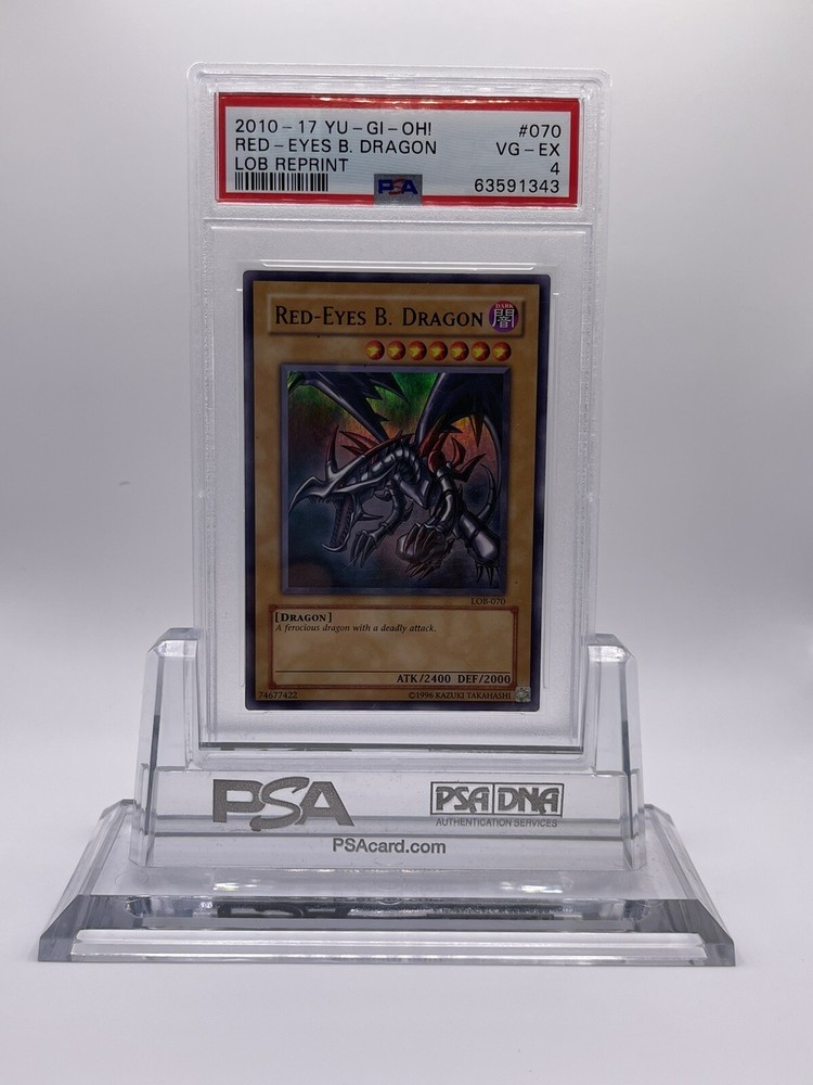 2010 YUGIOH RED EYES BLACK DRAGON PSA 4 VERY GOOD - EXCELLENT FAST SHIPPING This collectible card features the iconic Red Eyes Black Dragon from the Yu-Gi-Oh! Trading Card Game. It has been graded by Professional Sports Authenticator (PSA) and received a grade of 4. The card was manufactured in 2010 and is in excellent condition. Perfect for collectors and fans of the game, this card is a great addition to any collection. Its high grade ensures its authenticity and value. Don't miss out on the opportunity to own this rare piece of Yu-Gi-Oh! history.
