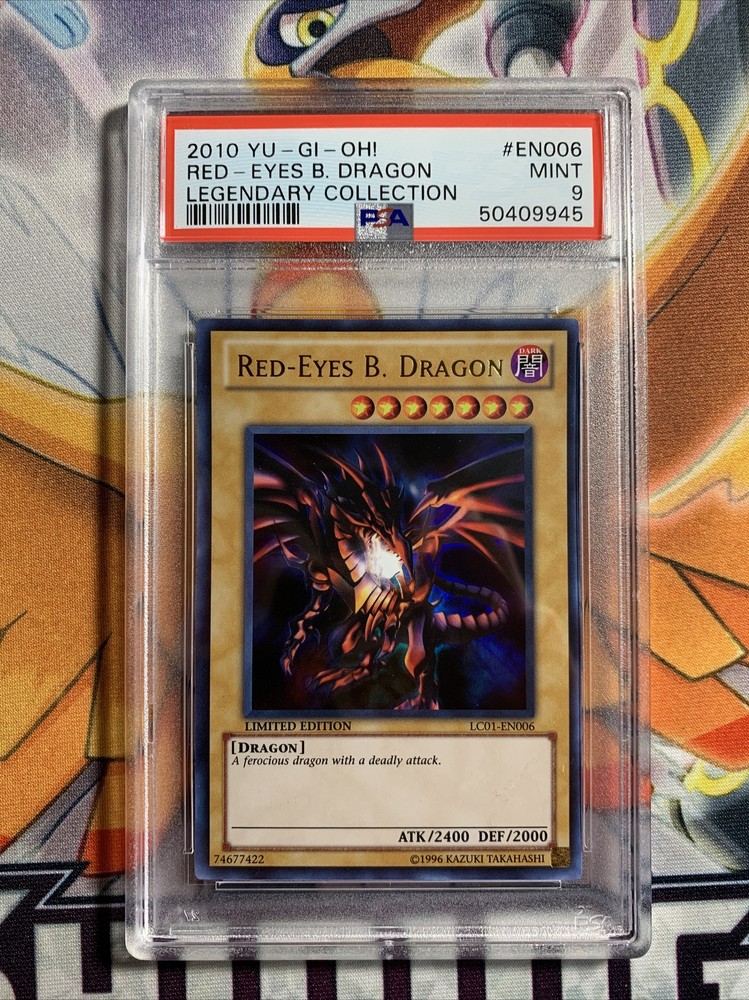 2010 Yugioh legendary collection Red Eyes Black Dragon LC01-EN006 Limited Edition PSA 9 MINT All psa cards come with free shipping inside the United States. From my personal collection, 100% authentic, Comes from a smoke free environment, Will ship very securely! What is pictured is exactly what you will receive. Be sure to check out my store for other cards,toys,games and collectibles! We take pride in high Quality PSA graded Cards. Note *Note to buyer all items come from smoke free home and from my personal collection! All PSA graded cards for sale have been my person submissions with psa in my name. Questions If you have any questions about items that I do not have listed that you are looking for I might have them just not listed message my store for inquiries. Cards, toys, and more Shipping *shipping all cards will be shipped in hard plastic sleeves*. All items will be Very well packaged for shipping!! We are not responsible for any import tax fees pertaining over seas shipping outside of the United States!! Returns- Are not accepted. All sales are final. Be sure to read the description, and look at photos closely. A purchase without doing so will be on the buyer as it is their mistake and will be no refunds. Also no orders will be canceled once the item is marked shipped with a shipping number,