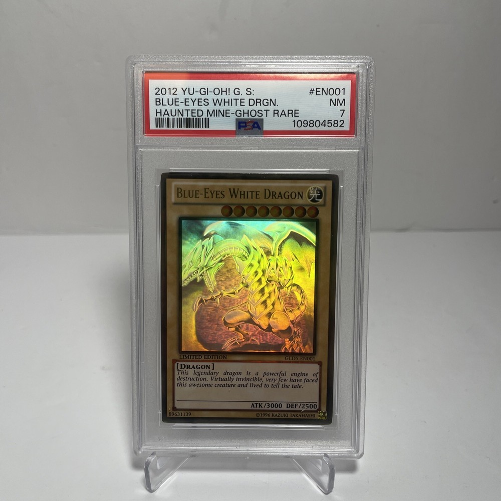2012 Yu-Gi-Oh! Blue-Eyes White Dragon GLD5-EN001 Ghost Gold Rare PSA 7 NM. Condition is Graded. Shipped with USPS First Class.