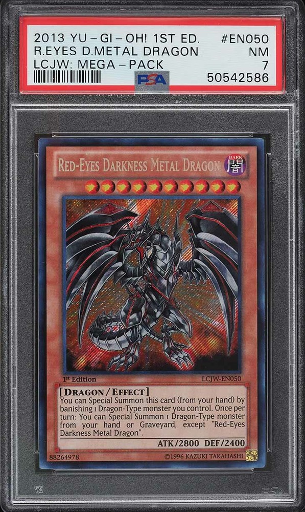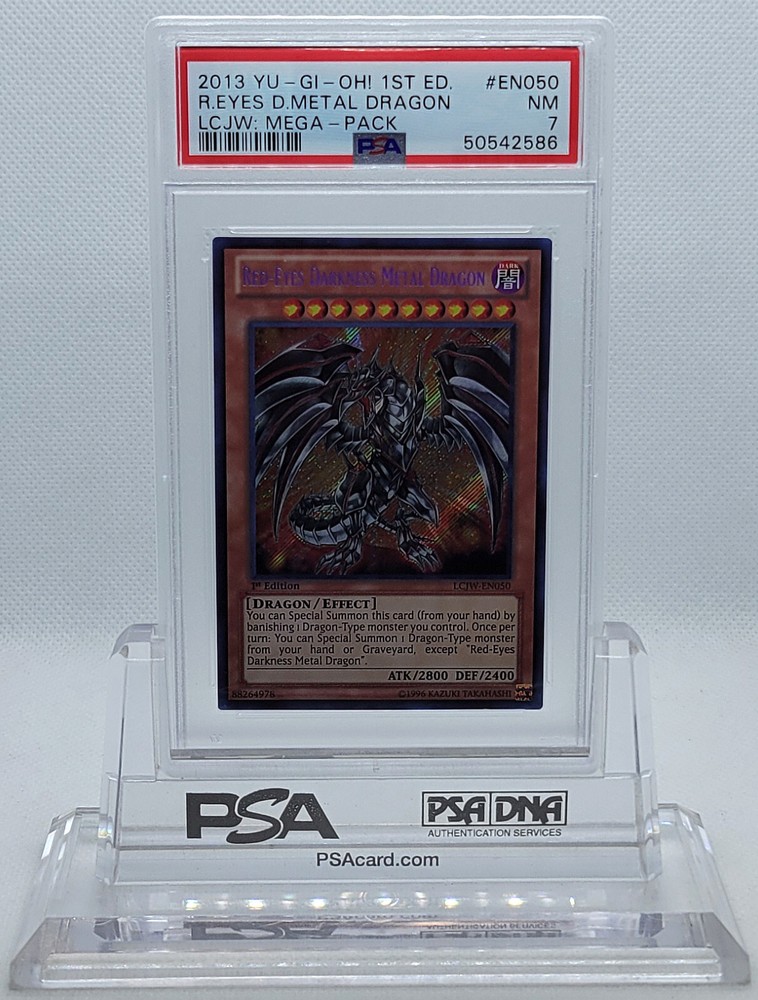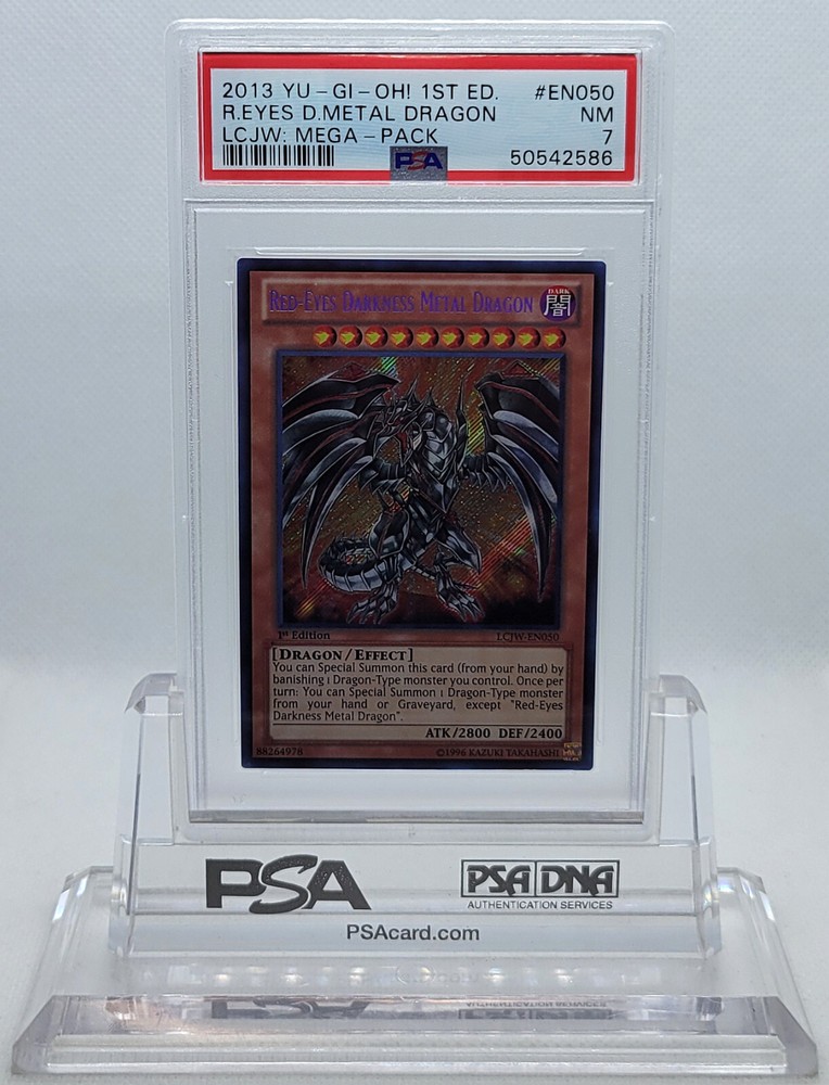 Description Condition: PSA 7 NM Availability: In Stock You are Purchasing 2013 YUGIOH 1ST ED LCJW-EN050 RED-EYES DARKNESS METAL DRAGON PSA 7 NM #50542586 Professionally graded by Professional Sports Authenticator (PSA) *PLEASE REVIEW PHOTO(S) BEFORE BIDDING/BUYING. >>MORE GRADED YUGIOH CARDS<< IG: CARD_RUSH_INC Payment Options Payment is expected within 7 days of your purchase date. We accept all forms of payments through Paypal. Shipping and Handling We ship to all U.S. states, U.S. territories, APO/FPO locations and any international countries listed under our "ship to" heading. Shipping and Handling is calculated based on the combined shipping weight of your item(s). Please use the shipping calculator to estimate your shipping and handling charges. In order to qualify for combined shipping terms, all items must be paid for in one payment; please do not pay until you are done bidding/shopping. Please contact us if you have any questions regarding our shipping and handling terms. Shipping and Delivery Packages are shipped out every Monday, Wednesday, and Friday. Domestic Packages take approximately 2-7 days to arrive. International packages may take a little longer to arrive, typically 1-4 weeks. Please allow ample transit times before inquiring about your package, thank you. Sales Tax Sales tax will be automatically collected by Ebay. Customer Service We will make every effort to get your purchase is mailed in a timely manner. Please contact us if you have any questions or concerns; we would love to hear any suggestions you have on how we can improve your eBay experience. Thank you for visiting us today.