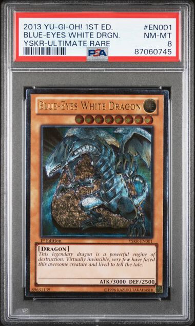 Description You are purchasing the item(s) listed in the table below. Shipping Unless stated otherwise, free shipping. All cards are shipped in a bubble mailer. All items are shipped within 24 hours. Weekends do not count as business days. All orders made on Fridays after 8AM EST and weekends will be shipped on the following Monday. International Shipping Only ship to eligible countries under the GSP (Global Shipping Program). Buyers are responsible for all international shipping fees. For more information, go to this link [http://pages.ebay.com/help/buy/shipping-globally.html] No Returns Quantity Name 1 BLUE-EYES WHITE DRAGON YSKR-EN001 Ultimate Rare 1ST EDITION PSA 8