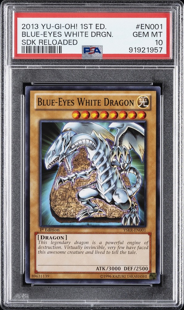 This PSA 10 Blue-Eyes White Dragon from the 2013 Kaiba Reloaded Starter Deck is a must-have for serious Yu-Gi-Oh! collectors. The card is in flawless condition, with sharp corners and perfect centering, making it a standout piece. Its 1st Edition status adds extra rarity and value. A true gem for fans of the iconic Kaiba deck—highly recommended for any collection!